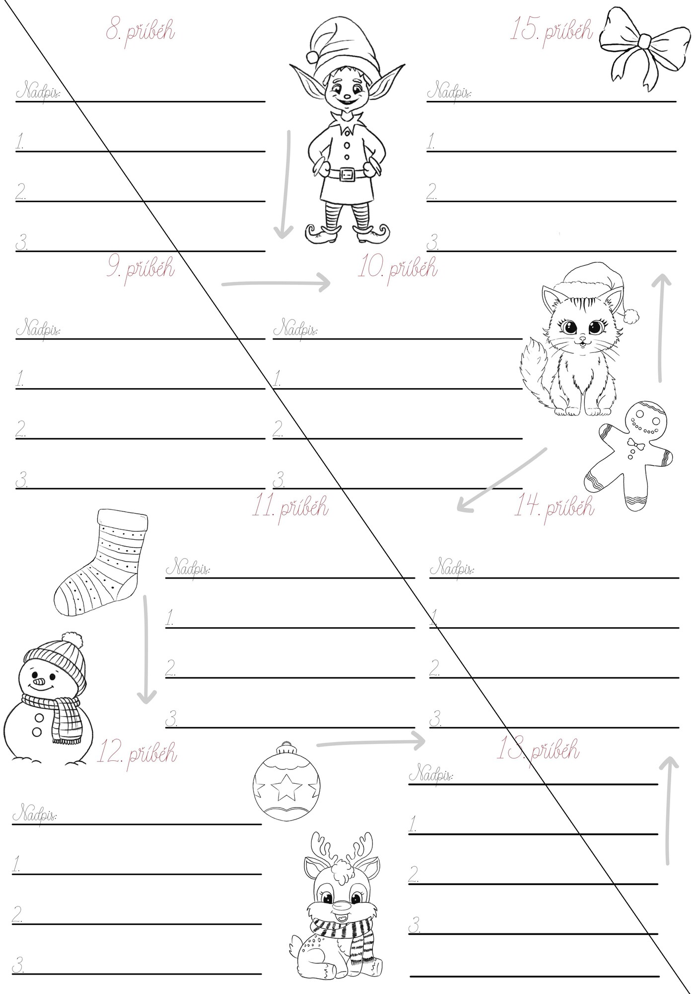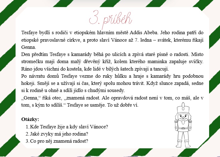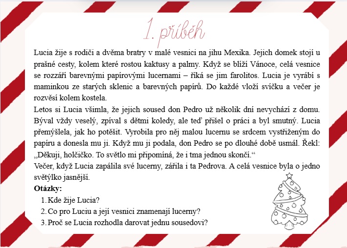 - Adventní kalendář ve škole – každý prosincový den si žáci přečtou jeden příběh, odpoví na otázky a vyplní políčko v pracovním listě. Pokud mají úkol splněný, vybarví si jeden obrázek. Takto můžete společně postupovat až do Vánoc.