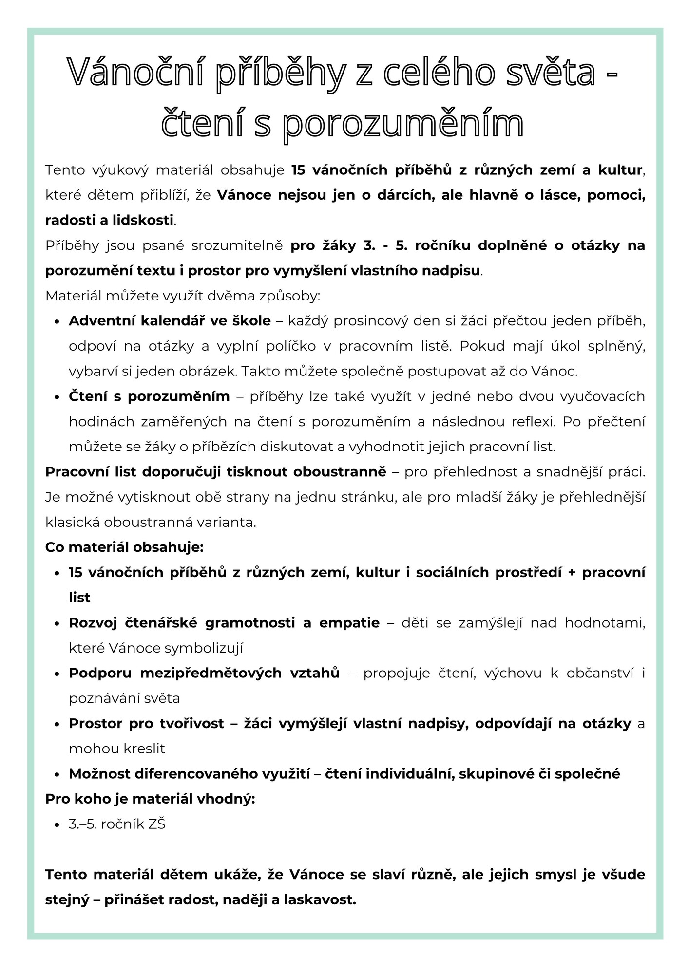 - 15 vánočních příběhů z různých zemí, kultur i sociálních prostředí + pracovní list