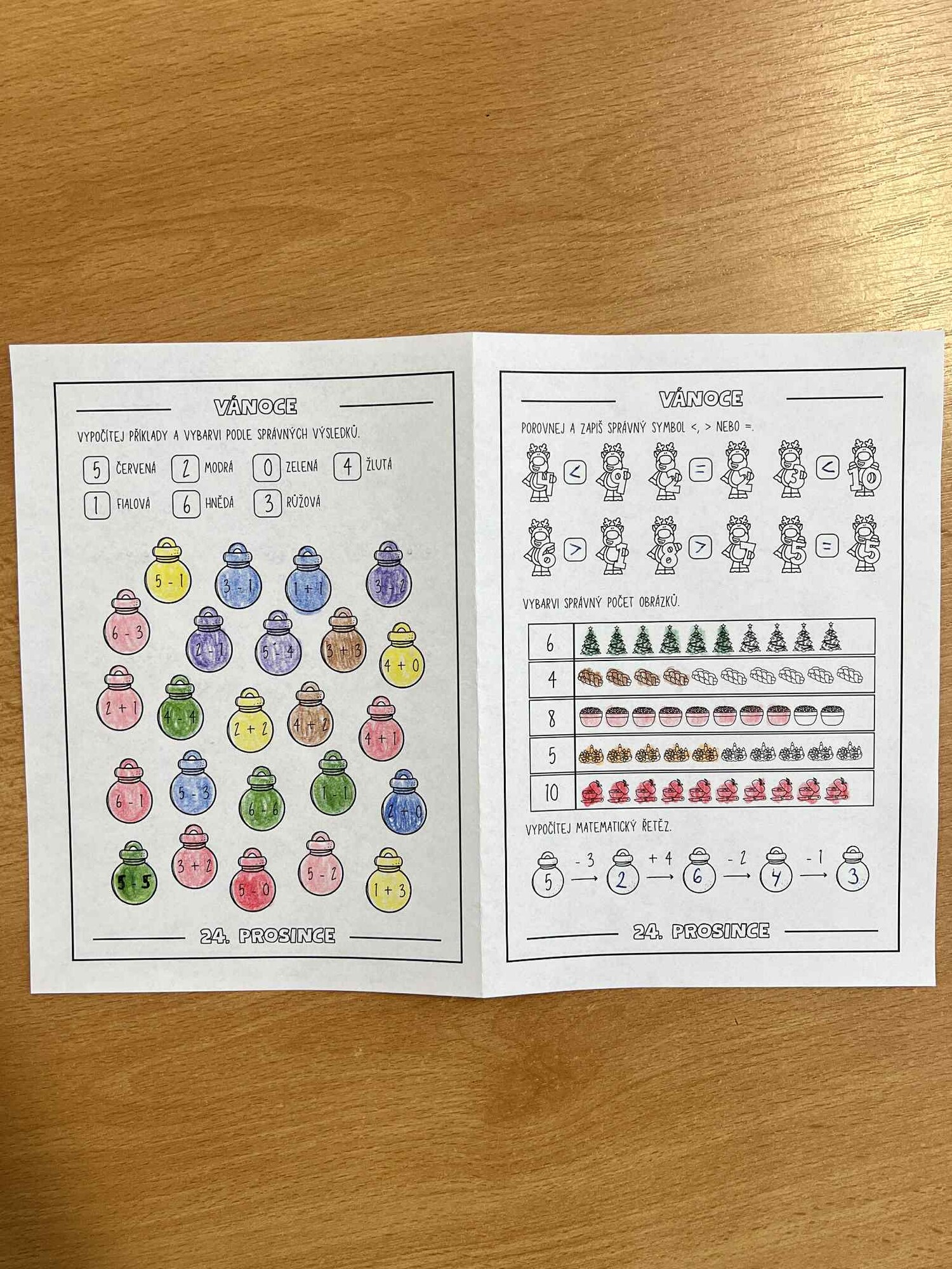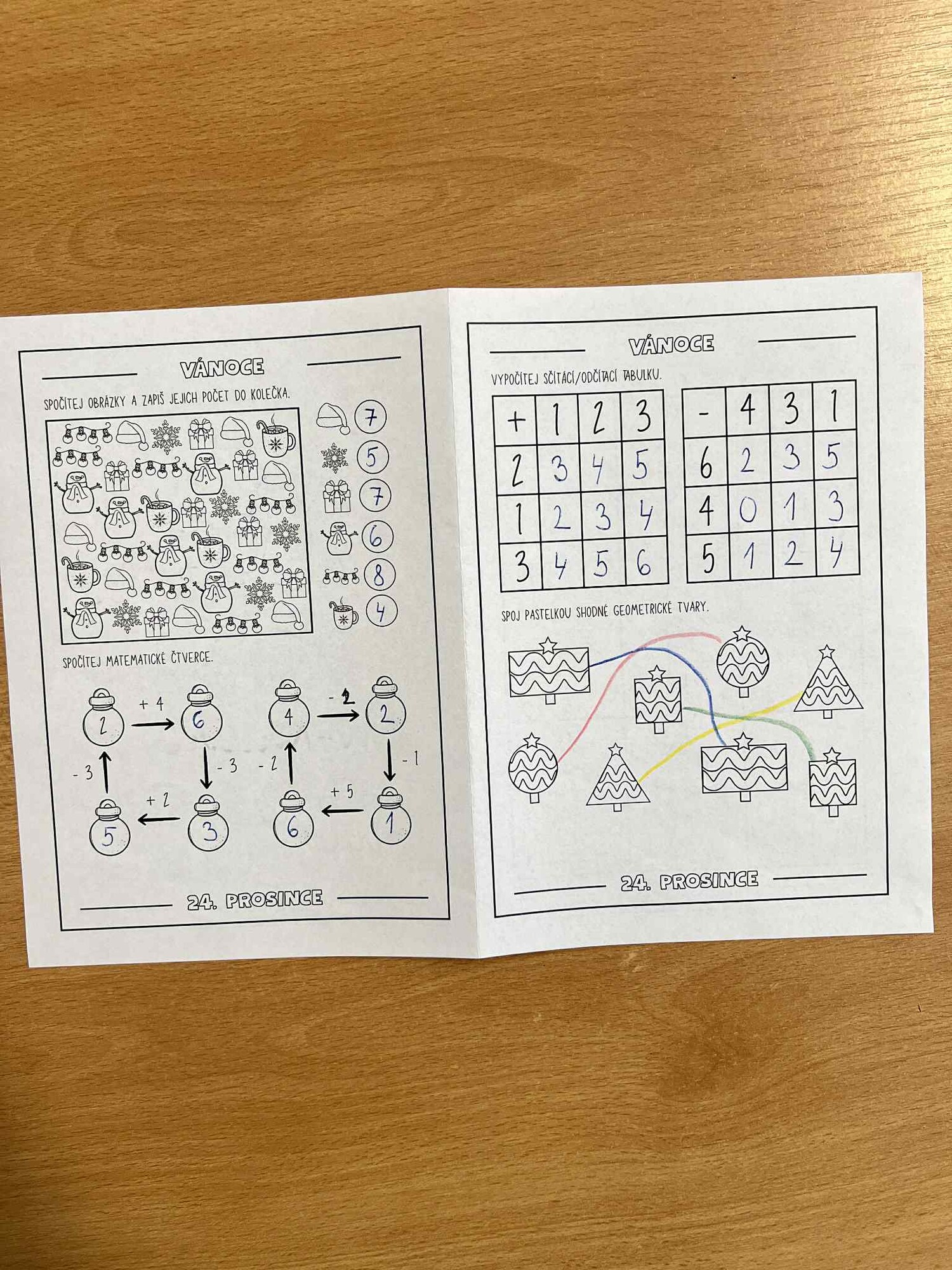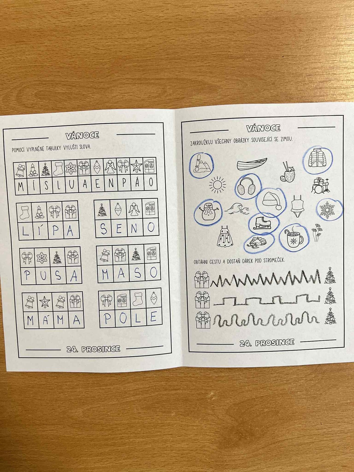 Pracovní listy jsou zpracovány ve formě černobílé knížečky určené pro žáky prvních tříd. Obsahují úkoly s vánoční tématikou, které propojují zábavu s procvičováním učiva z českého jazyka a matematiky.