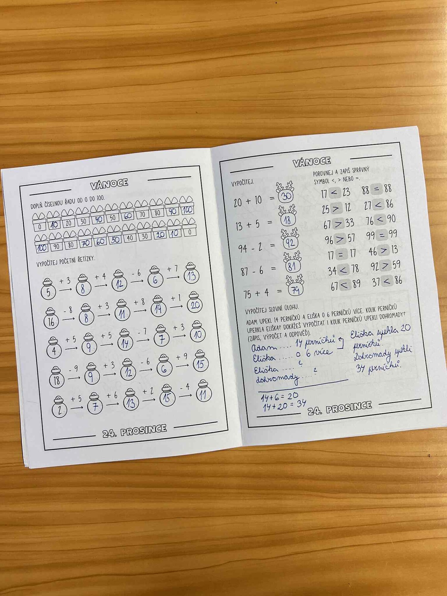 Matematická část zahrnuje seřazování čísel od nejmenšího po největší, sčítací a odčítací tabulky, matematické čtverce, doplňování číselných řad po desítkách do 100, matematické řetízky, porovnávání a slovní úlohu. Obsahuje počítání v oboru do 20 s přechodem i bez přechodu a počítání do 100.