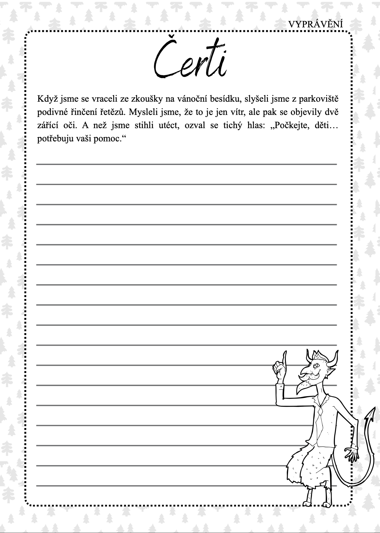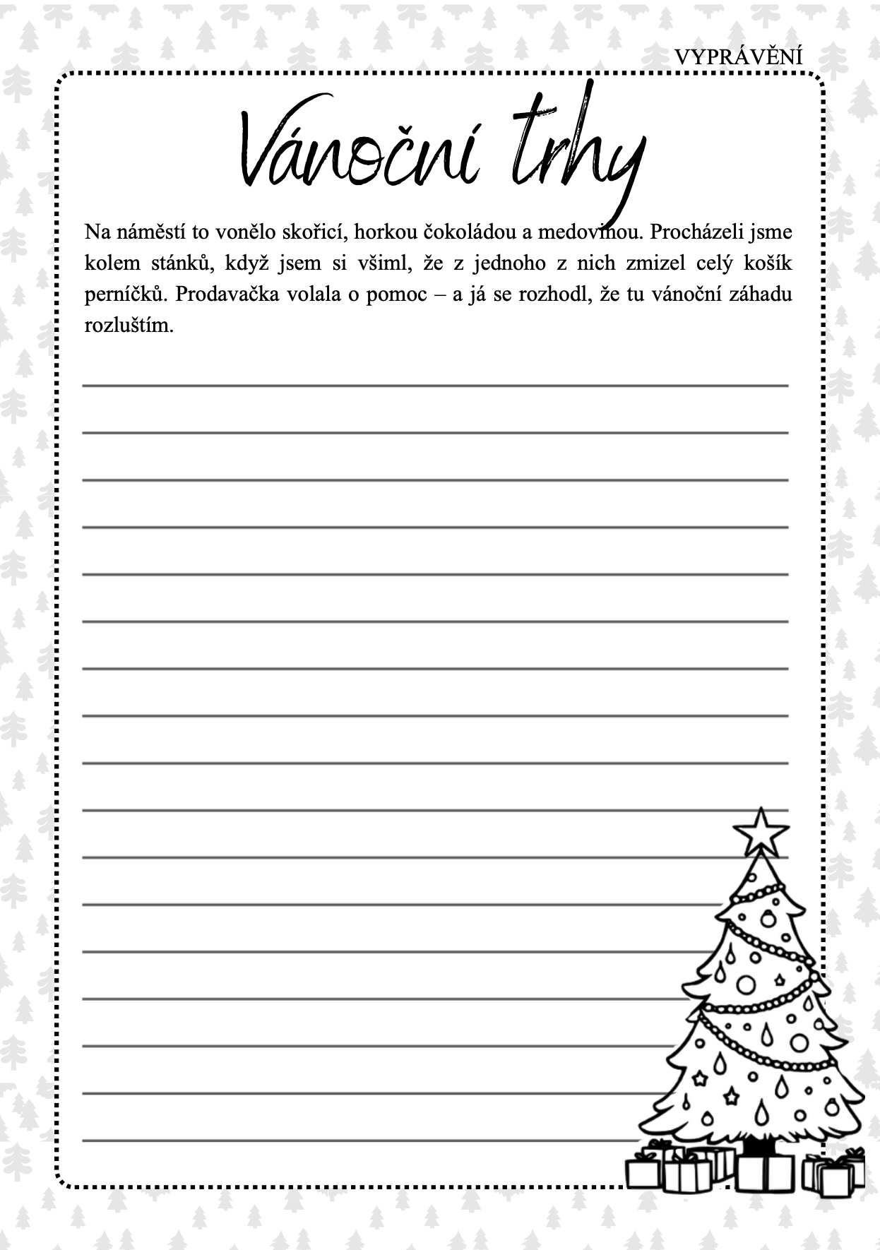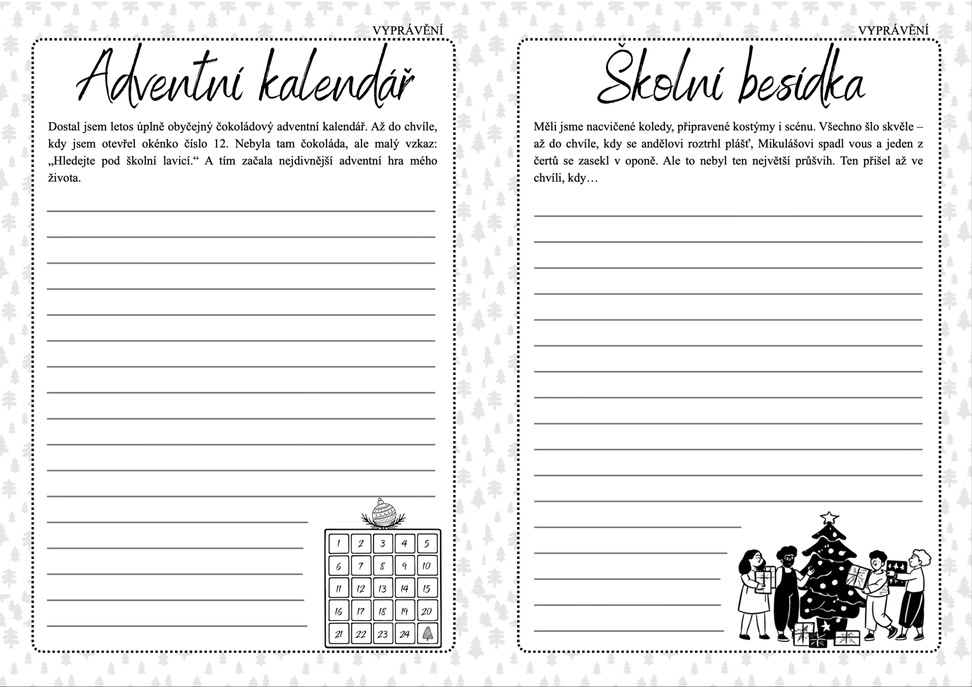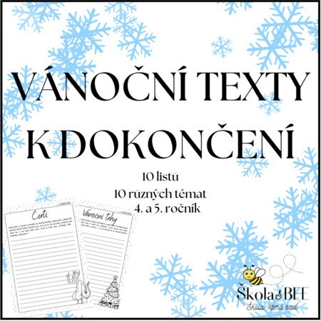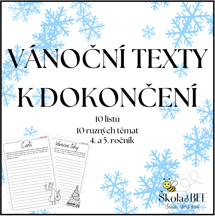 Připravila jsem sadu 10 pracovních listů s vánočními začátky příběhů, které žáci sami dokončují. Každý list má jiné téma (Barborky, Mikuláš, Anděl, Adventní kalendář, Štědrý den, Vánoční trhy, Betlém, Ježíšek, Čerti, Školní besídka) a jiný žánr – vyprávění, popis, dopis nebo krátkou pohádku.