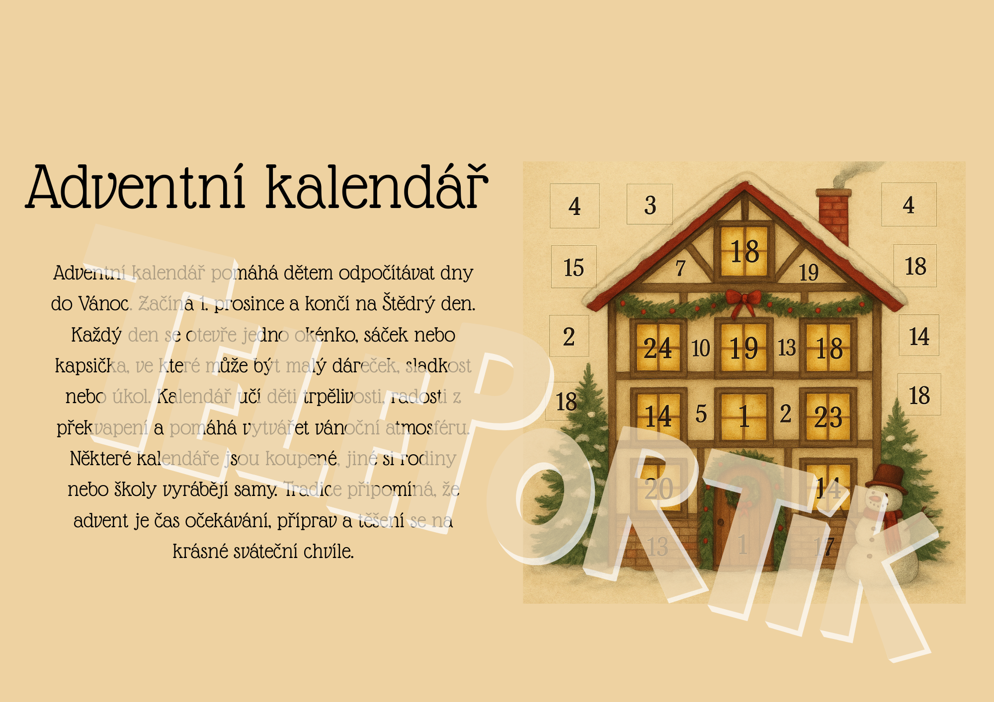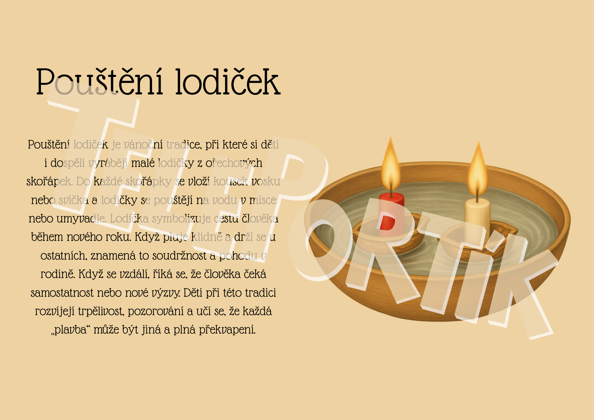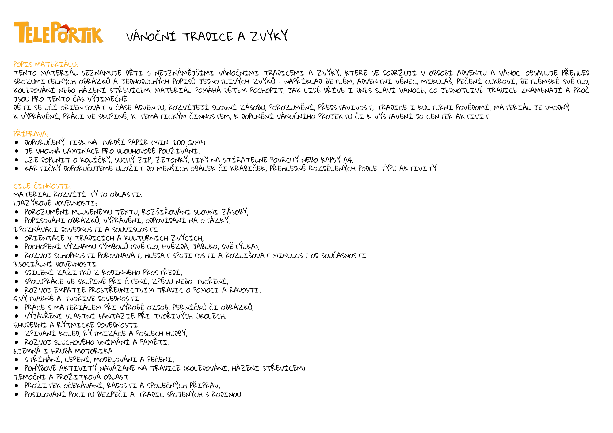 Tato rozsáhlá sada 30 vánočních tradic a zvyků přináší dětem i dospělým možnost seznámit se s těmi nejdůležitějšími součástmi českých Vánoc. Každá kartička obsahuje ilustraci tradice a stručný, srozumitelný text, který vysvětluje její význam a původ. Materiál je vytvořen tak, aby byl snadno použitelný v mateřských školách, družinách, dětských skupinách i v rodinách.