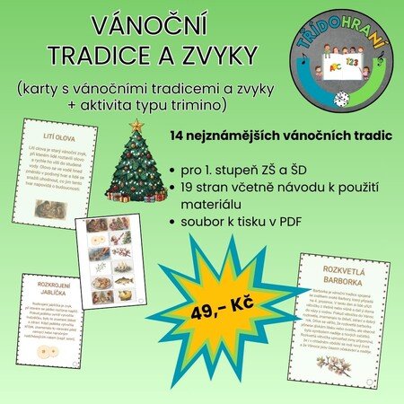 Soubor karet s popisem 14 nejznámějších českých vánočních tradic a zvyků určený pro 1. stupeň ZŠ a školní družinu.