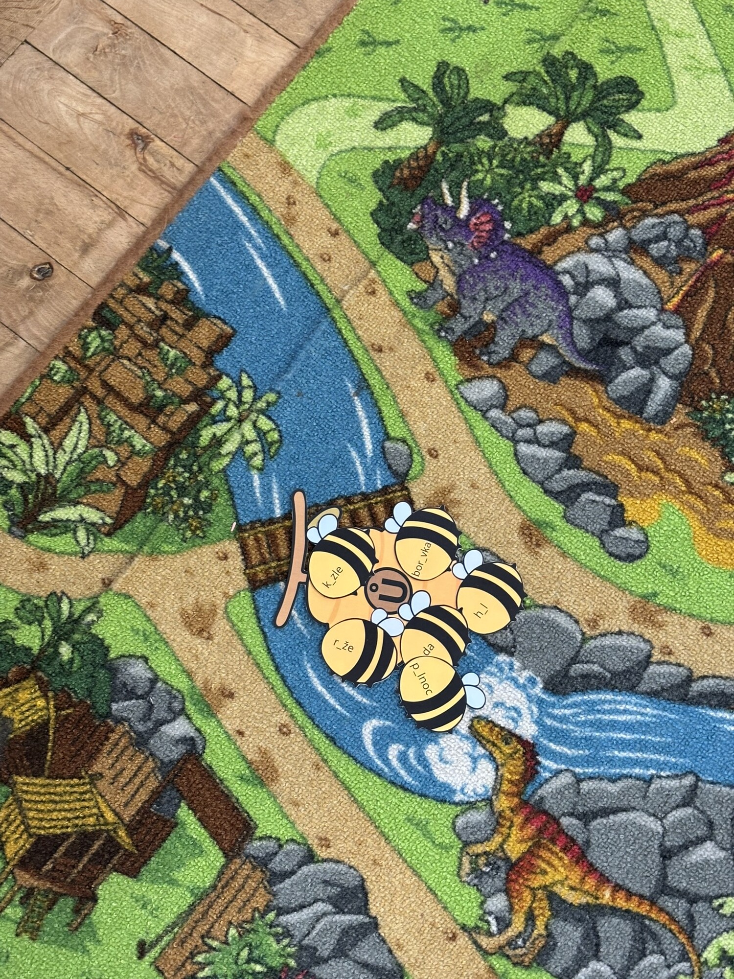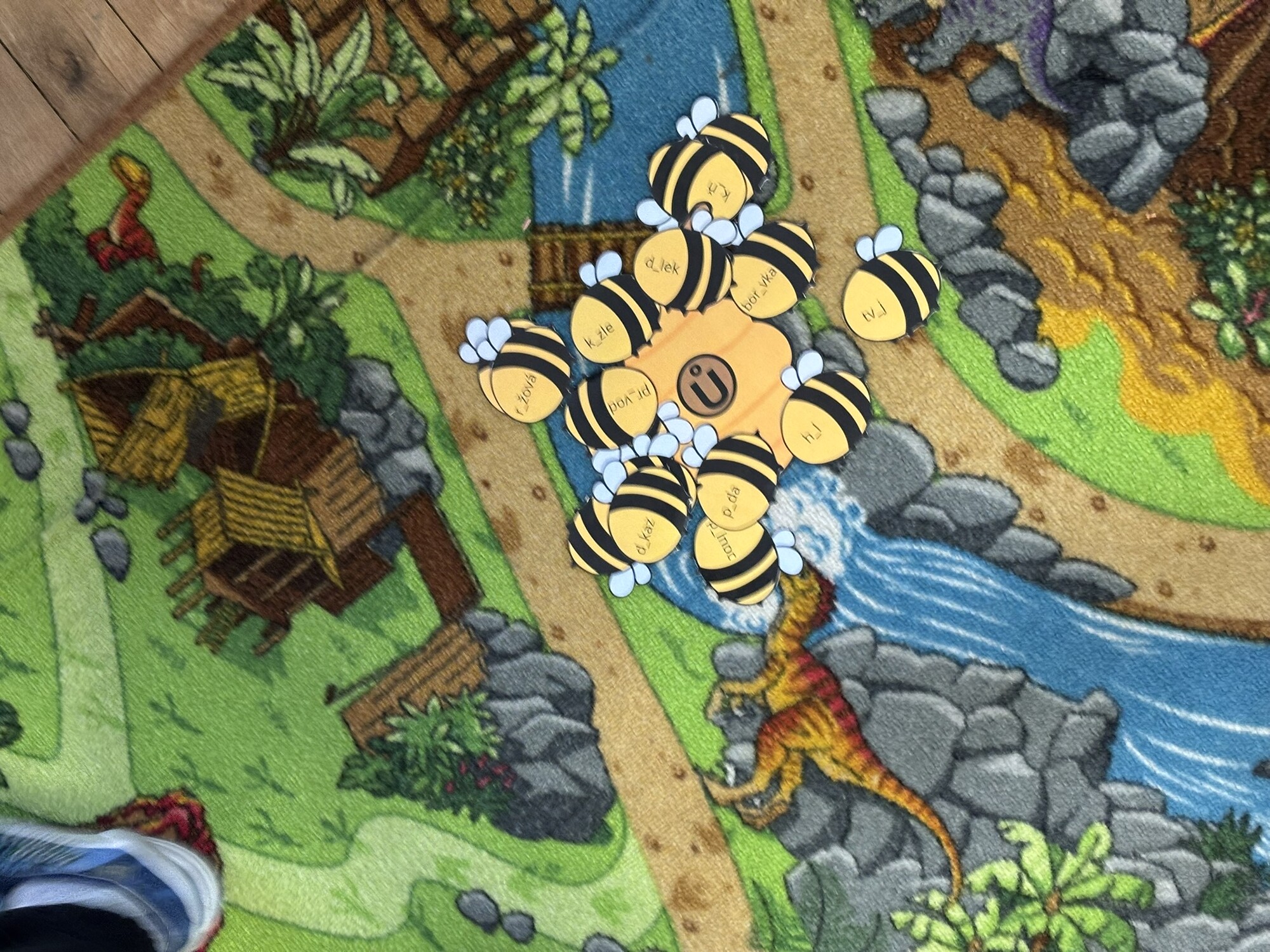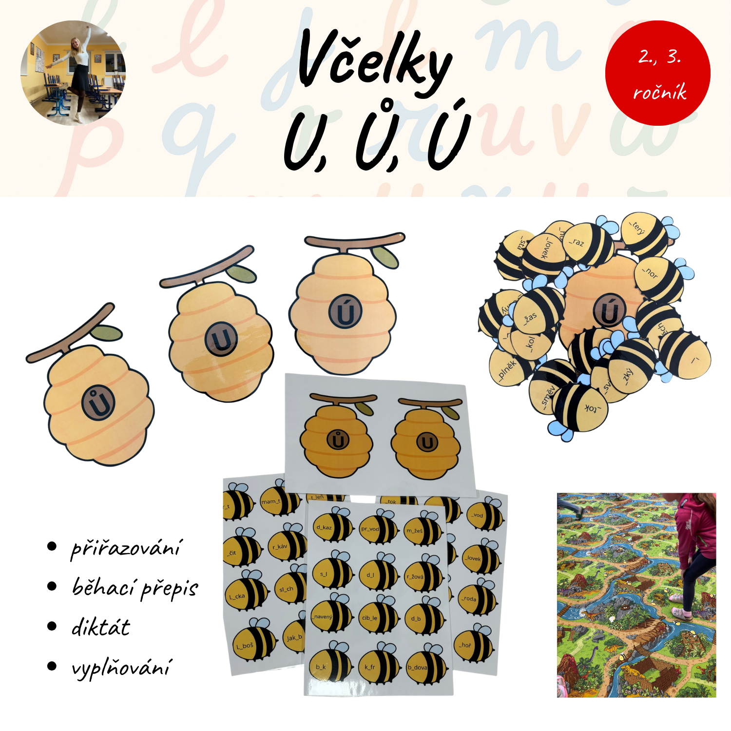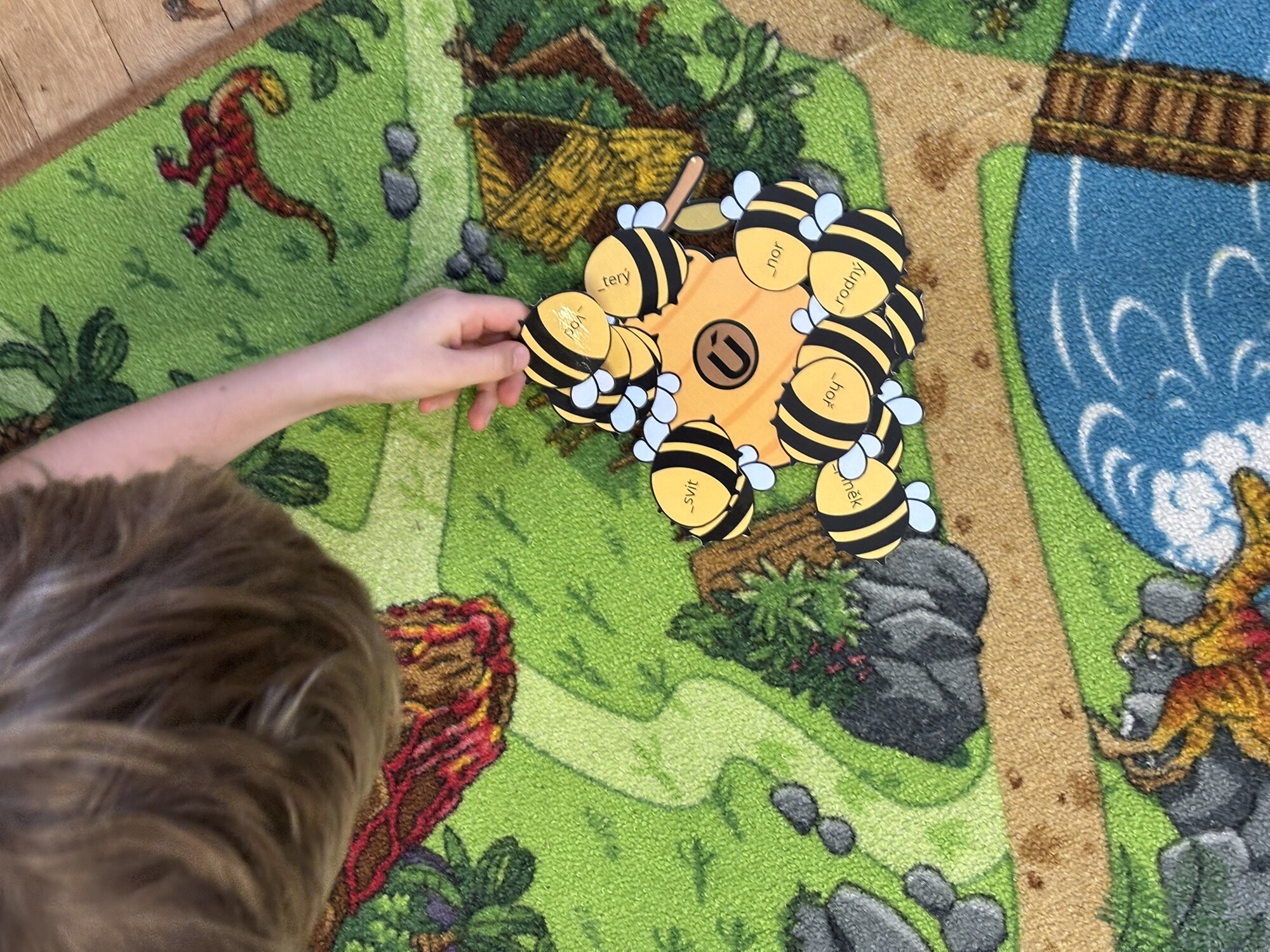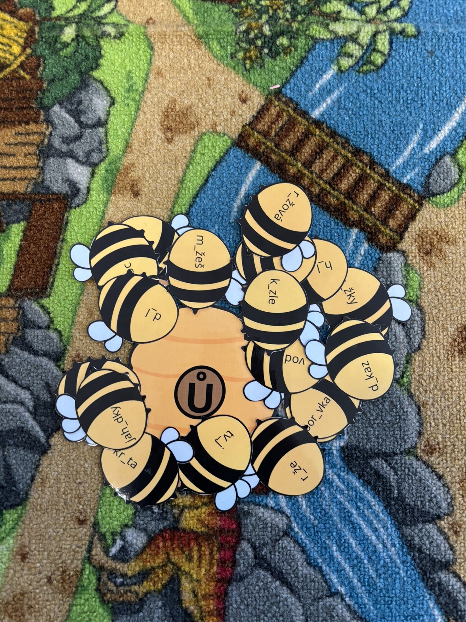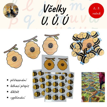Děti doplňují chybějící písmena U, Ů, Ú na včelkách a přiřazují je ke správným úlům.