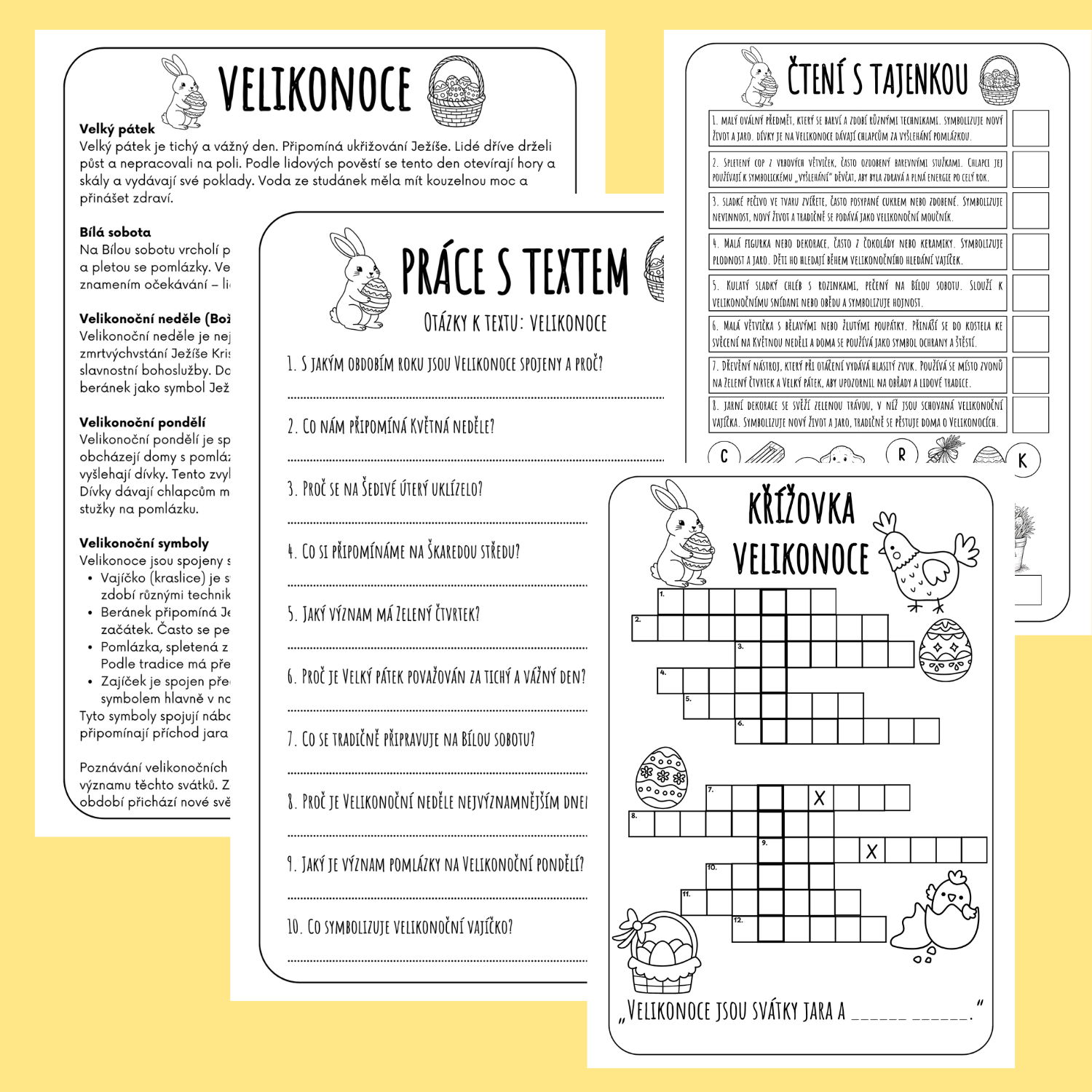 ráda bych Vám představila soubor aktivit zaměřených na rozvoj čtenářské gramotnosti a práci s textem. Tentokrát je materiál věnován tématu Velikonoce. Soubor je určen pro žáky 3. – 5. ročníku a je vhodný k využití v hodinách čtení a českého jazyka.