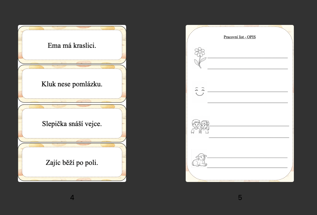 V části český jazyk žáci pracují s opisem a přepisem vět. Materiál obsahuje kartičky i pracovní listy. Děti vyhledávají věty, zapamatují si je a správně zapíší do pracovního listu.