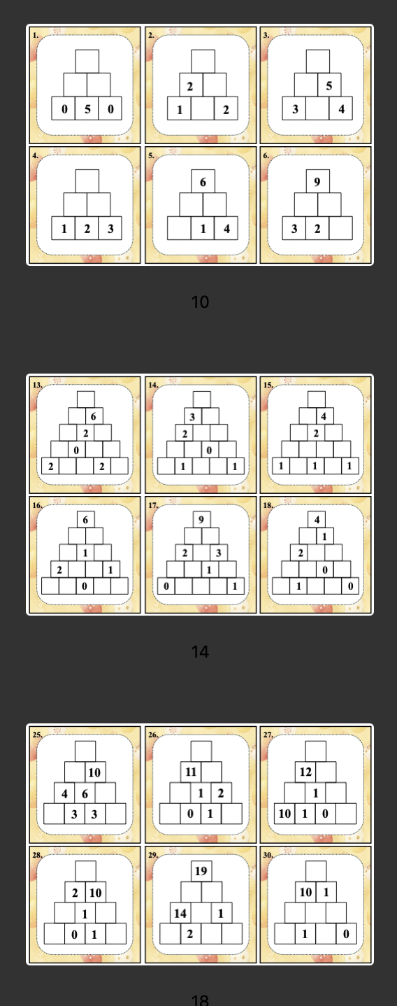 V části matematika žáci řeší sčítací pyramidy do 20 bez přechodu přes desítku. Kartičky jsou pomyslně rozděleny do dvou částí – numerace do 10 a numerace do 20 – a postupně gradují od jednodušších po náročnější.