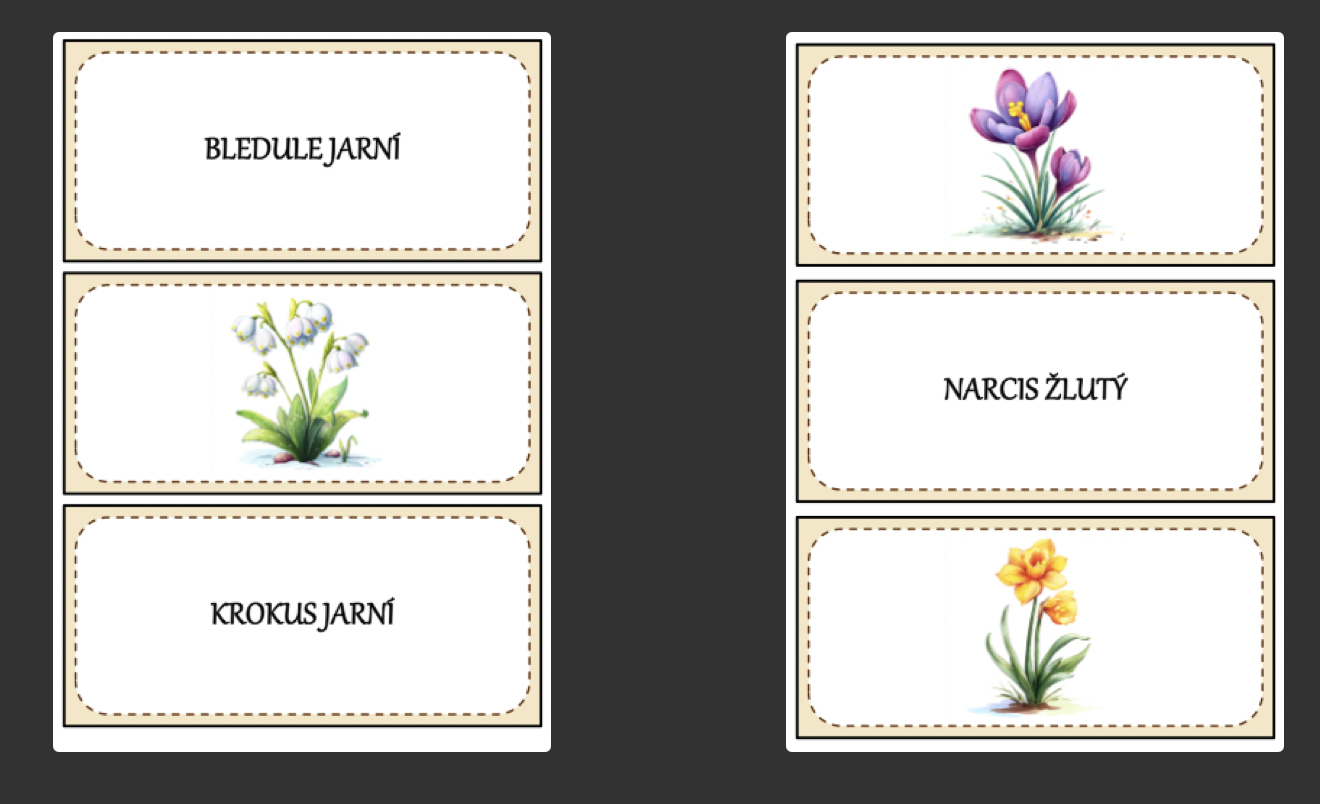 V části prvouka žáci přiřazují názvy k obrázkům jarních květin. Aktivita rozvíjí poznávání přírody, slovní zásobu i pozornost.