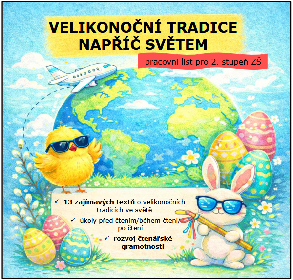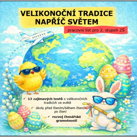 Velikonoce jsou svátky, které mají v českém prostředí silnou tradici, ale jejich podoba se v různých částech světa výrazně liší. Právě tato rozmanitost nabízí ideální příležitost k práci s informačními texty, rozvoji čtenářské gramotnosti a zároveň k rozšiřování kulturního povědomí žáků. Předkládaný pracovní list umožňuje žákům nahlédnout do velikonočních tradic napříč světem a vede je k aktivní práci s textem – od prvotní motivace přes porozumění až po vlastní reflexi.