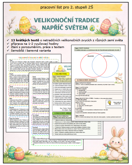 Pracovní list je zaměřen na rozvoj čtenářské gramotnosti prostřednictvím 13 krátkých textů o netradičních velikonočních zvycích z různých zemí světa. Úkoly jsou strukturovány do tří fází (před čtením, během čtení, po čtení) a podporují porozumění textu, práci s informacemi, srovnávání, vyvozování závěrů i formulaci vlastního názoru.