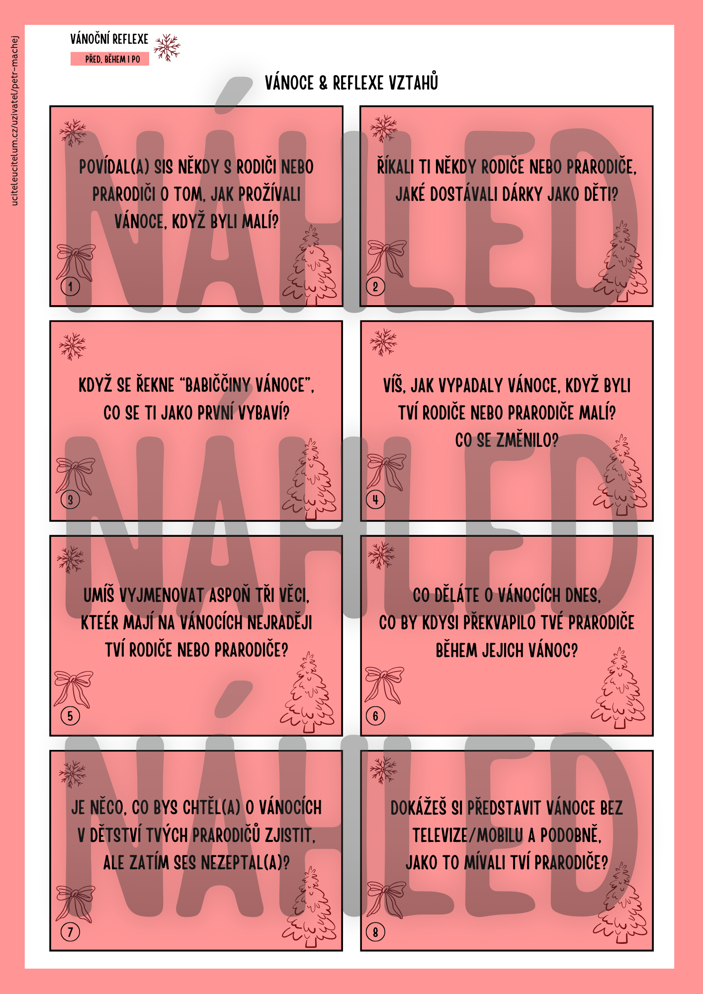 - Soubor karet “Vánoce a reflexe vztahů” vede žáky v diskuzi ke zvědomování a přemýšlení o vlastní rodině, a to napříč generacemi. Přemýšlí třeba i nad tím, jaké pocity prožívají o Vánocích jejich blízcí a podobně.
