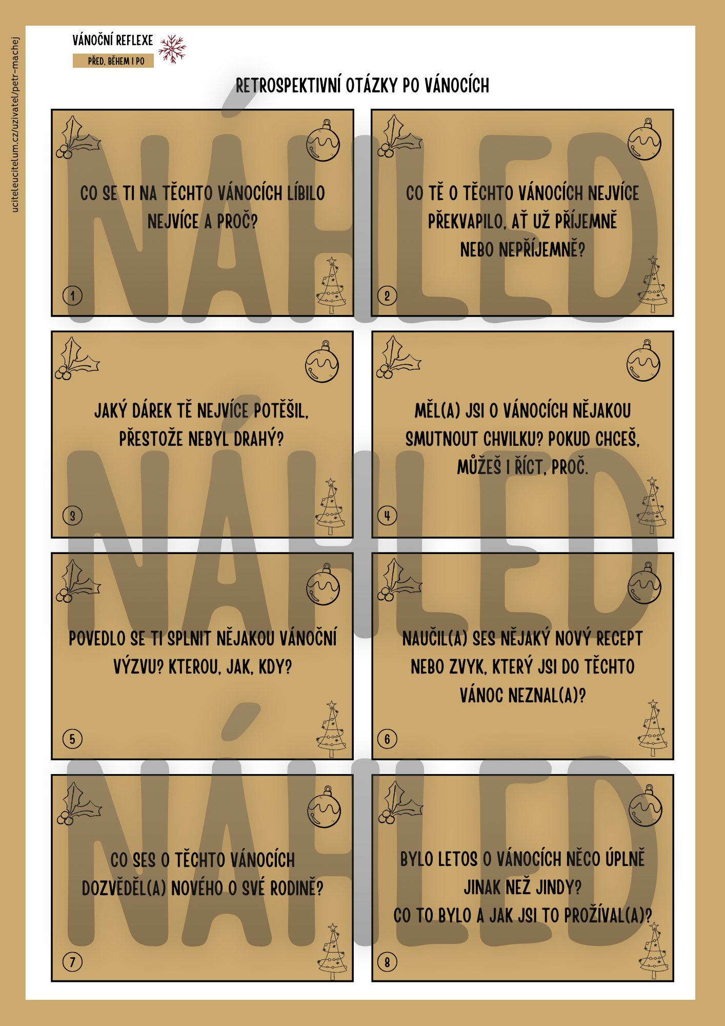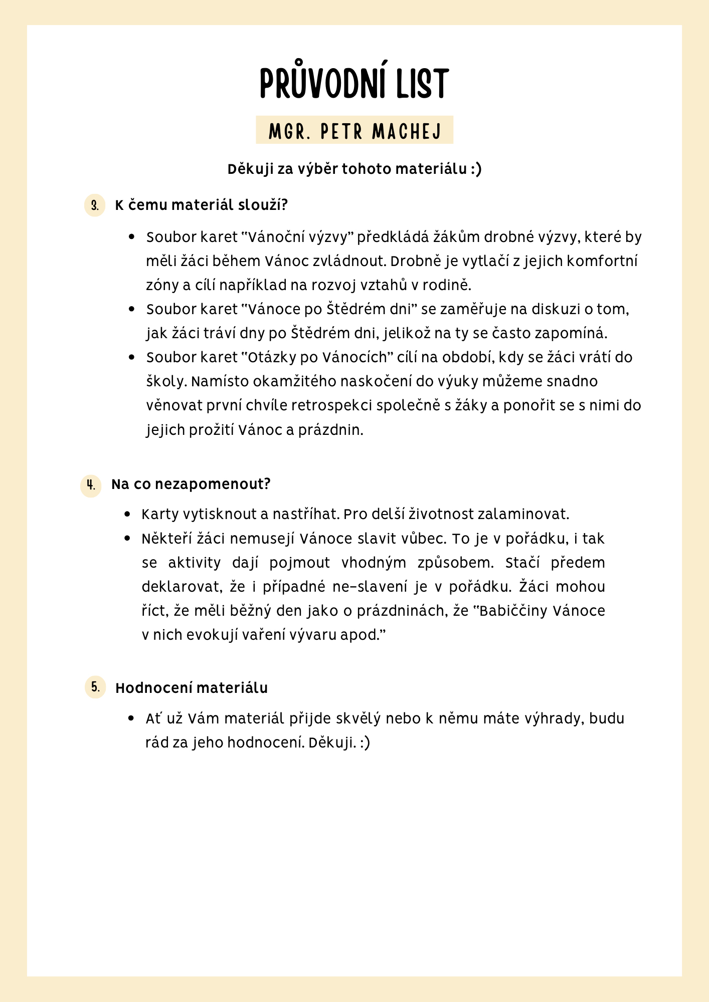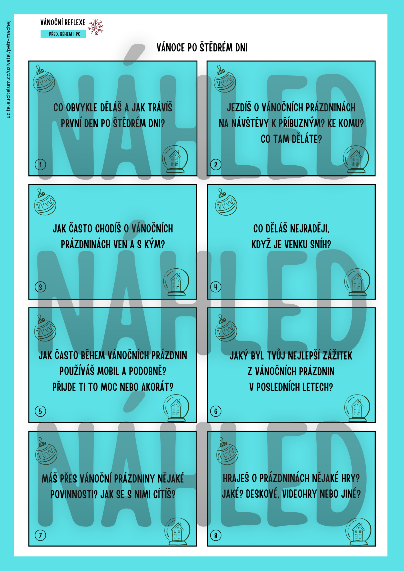 - Soubor karet “Vánoce po Štědrém dni” se zaměřuje na diskuzi o tom, jak žáci tráví dny po Štědrém dni, jelikož na ty se často zapomíná.