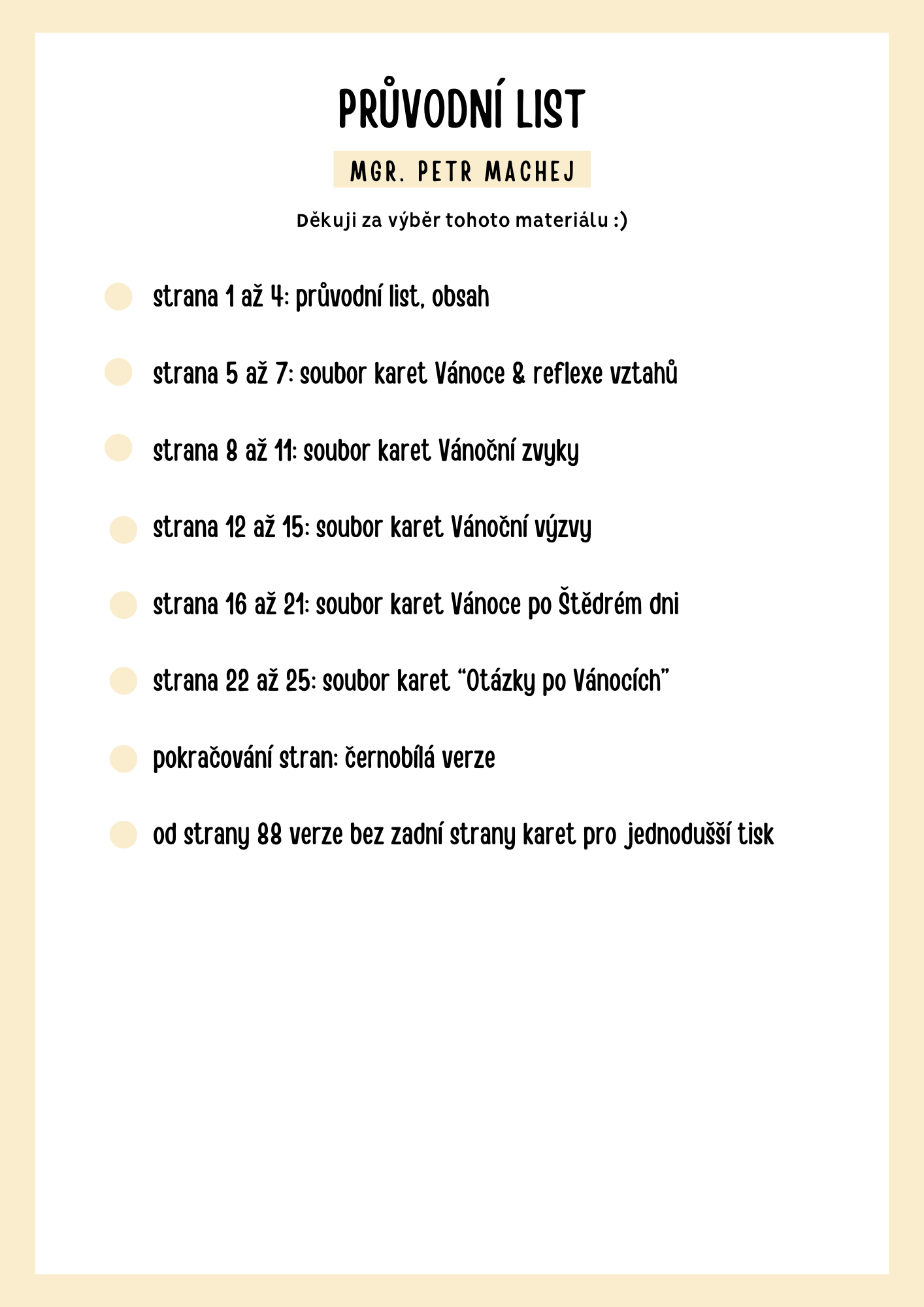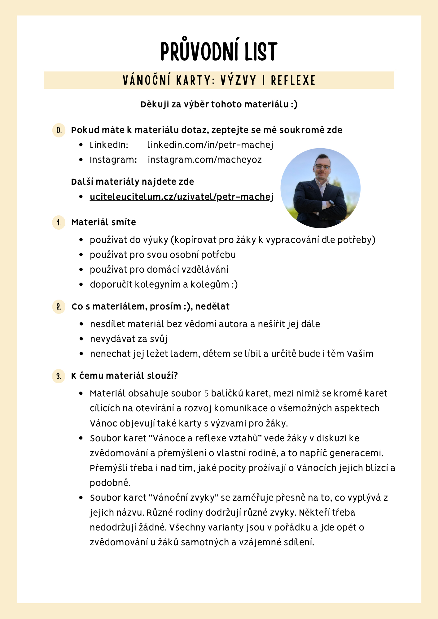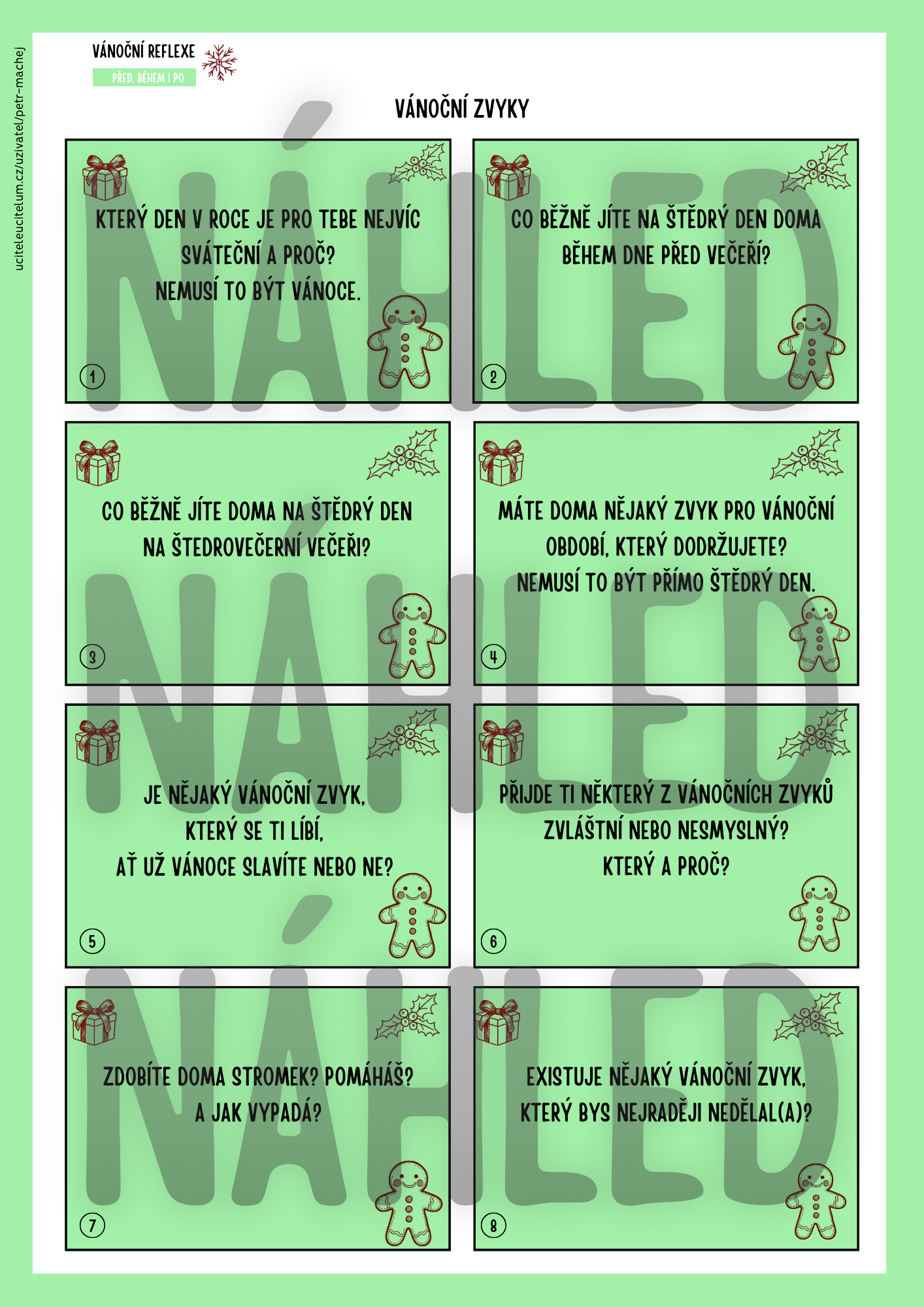 - Soubor karet “Vánoce po Štědrém dni” se zaměřuje na diskuzi o tom, jak žáci tráví dny po Štědrém dni, jelikož na ty se často zapomíná.