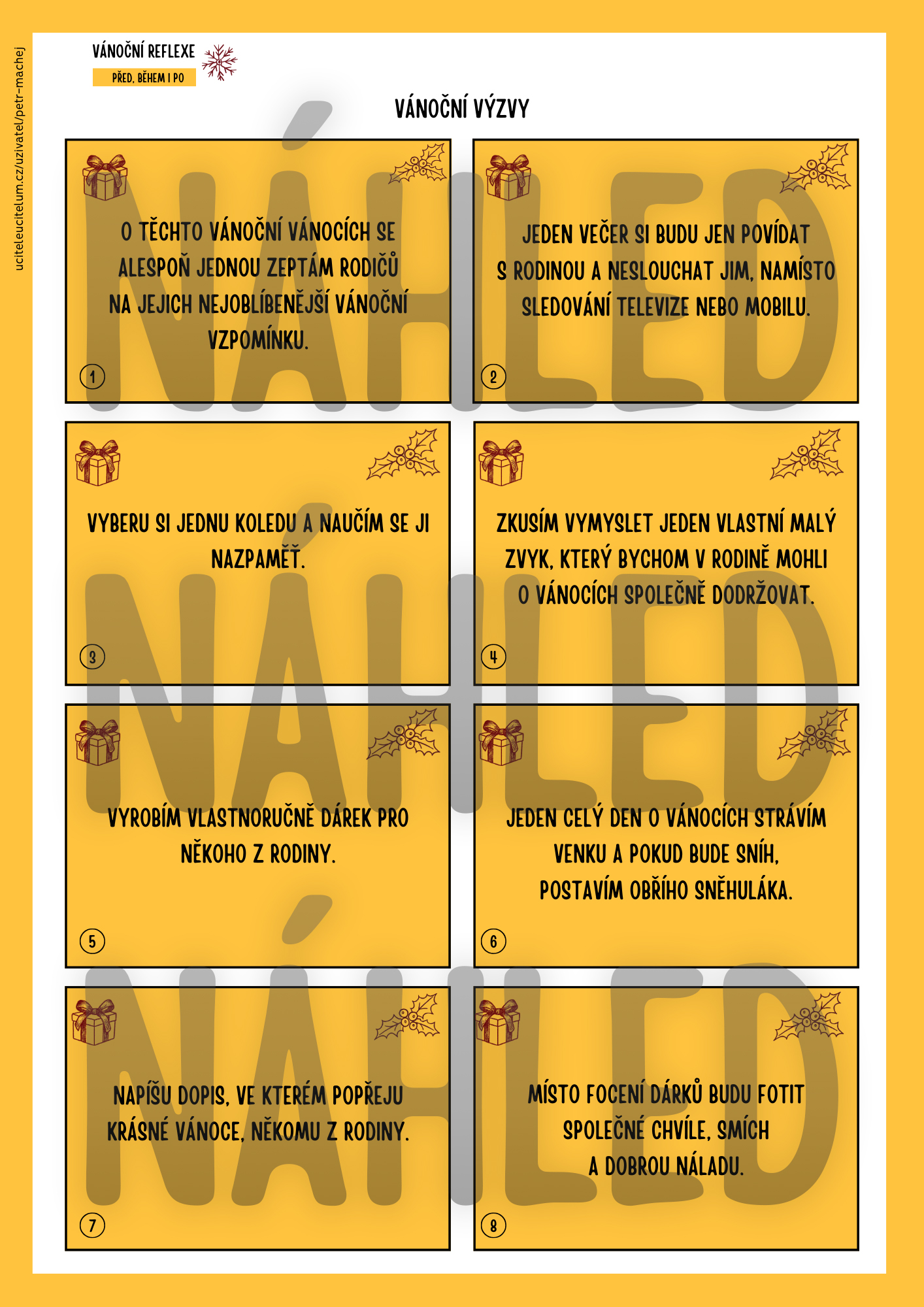 - Soubor karet “Vánoční výzvy” předkládá žákům drobné výzvy, které by měli žáci během Vánoc zvládnout. Drobně je vytlačí z jejich komfortní zóny a cílí například na rozvoj vztahů v rodině.