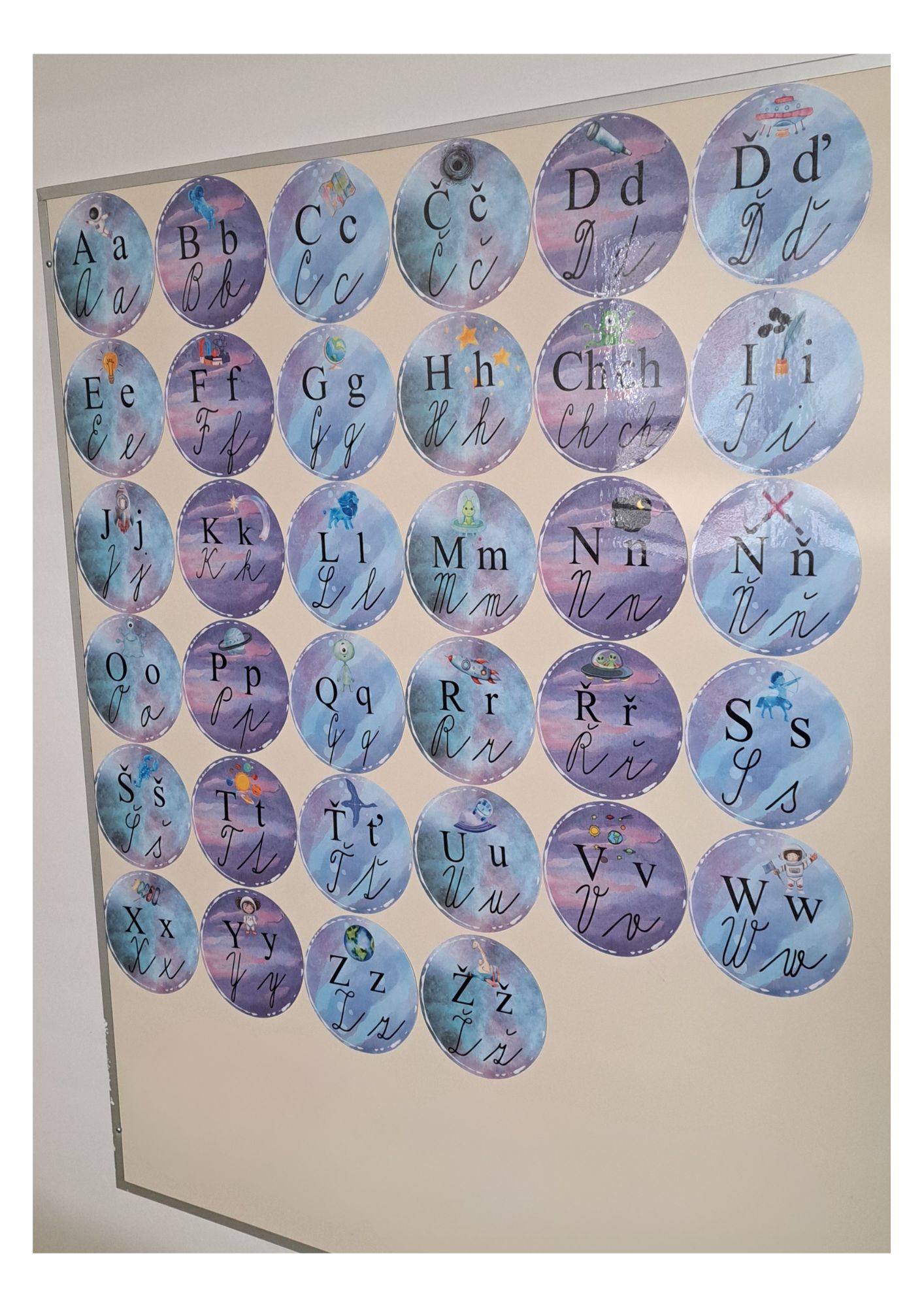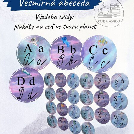 Materiál slouží k vyvozování či opakování abecedy a je vhodný jako výzdoba třídy. Písmena jsou zobrazena ve všech čtyřech tvarech na barevných planetkách. Materiál je vhodný pro 1. stupeň ZŠ, zejména od 1. do 3. třídy.