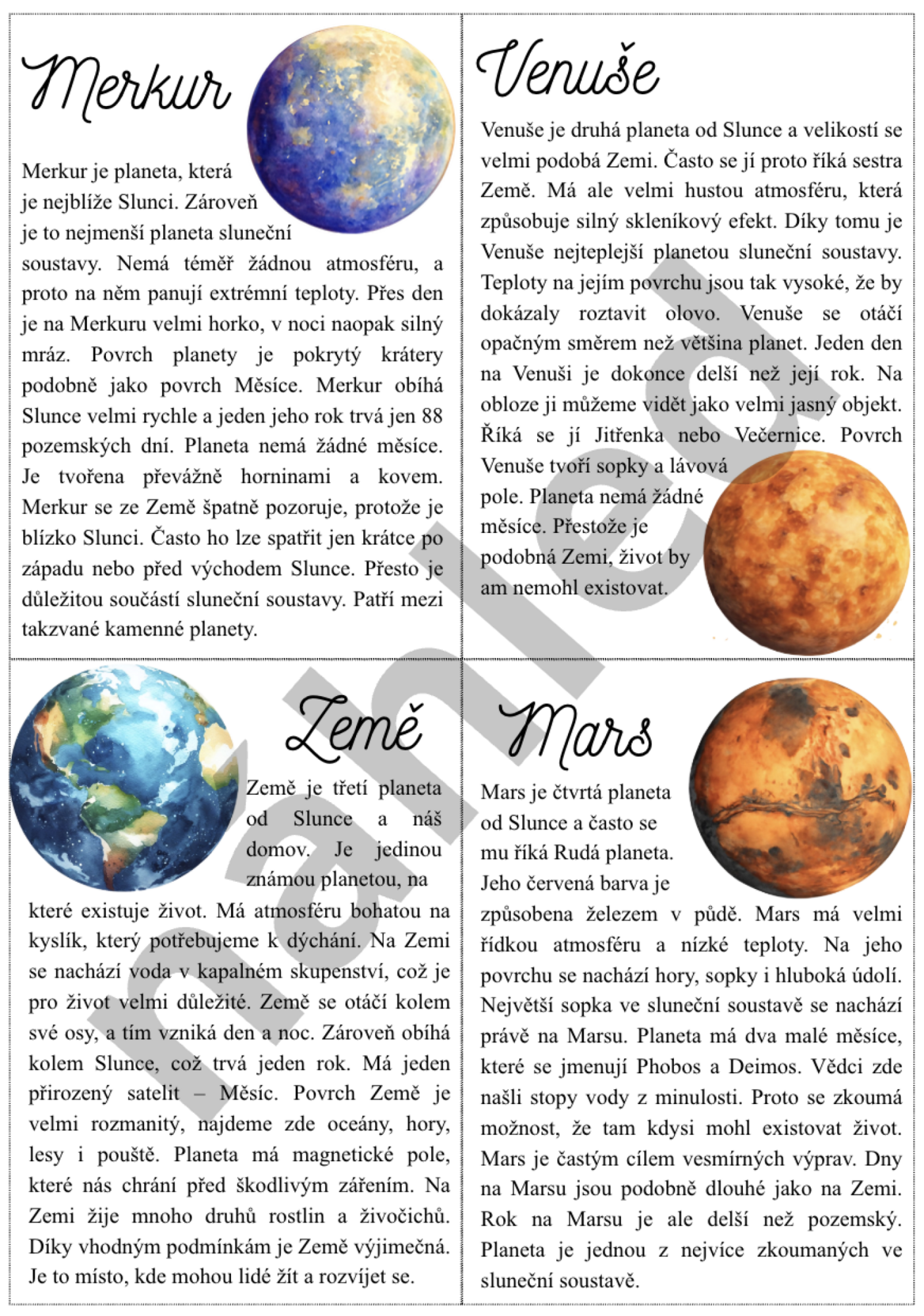 Soubor obsahuje 16 tematických karet s texty o Vesmíru, určených pro 4. a 5. ročník ZŠ. Texty jsou psány srozumitelně, přehledně a kombinují základní informace se zajímavostmi, díky čemuž se s nimi velmi dobře pracuje v hodinách přírodovědy i českého jazyka.