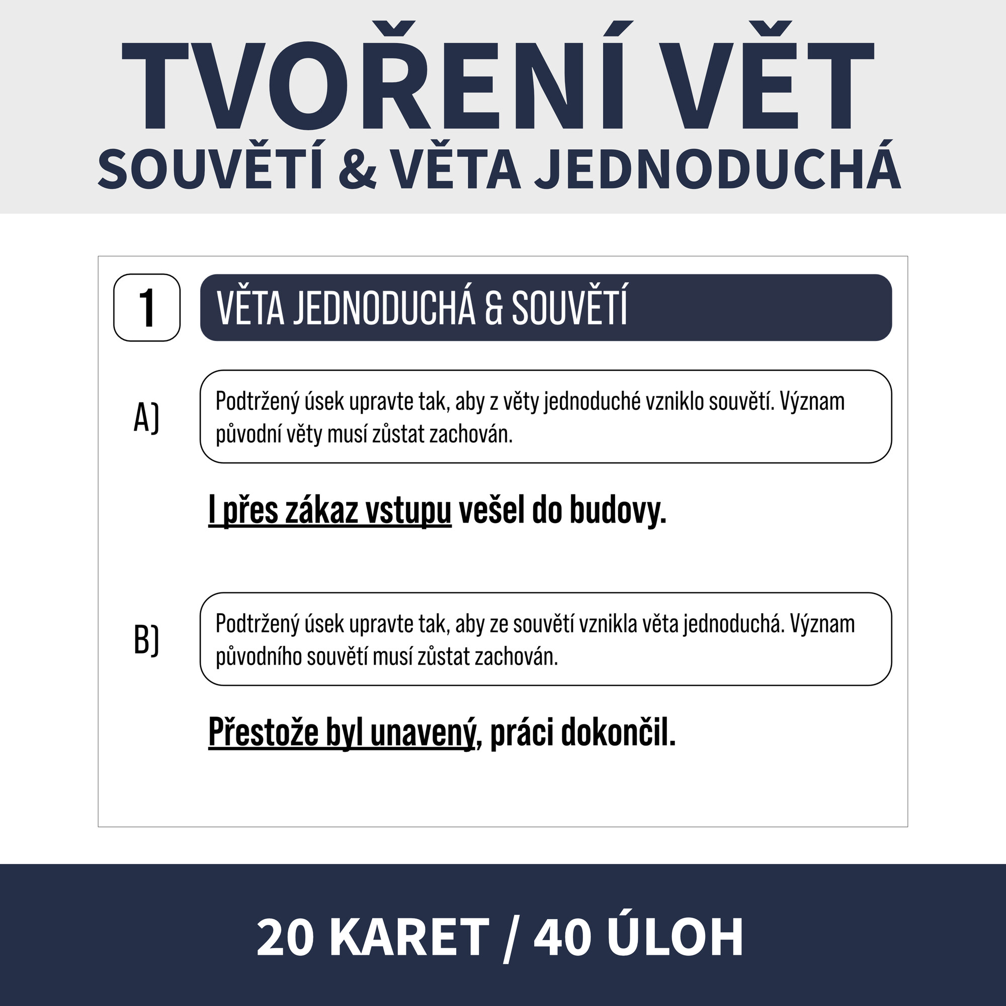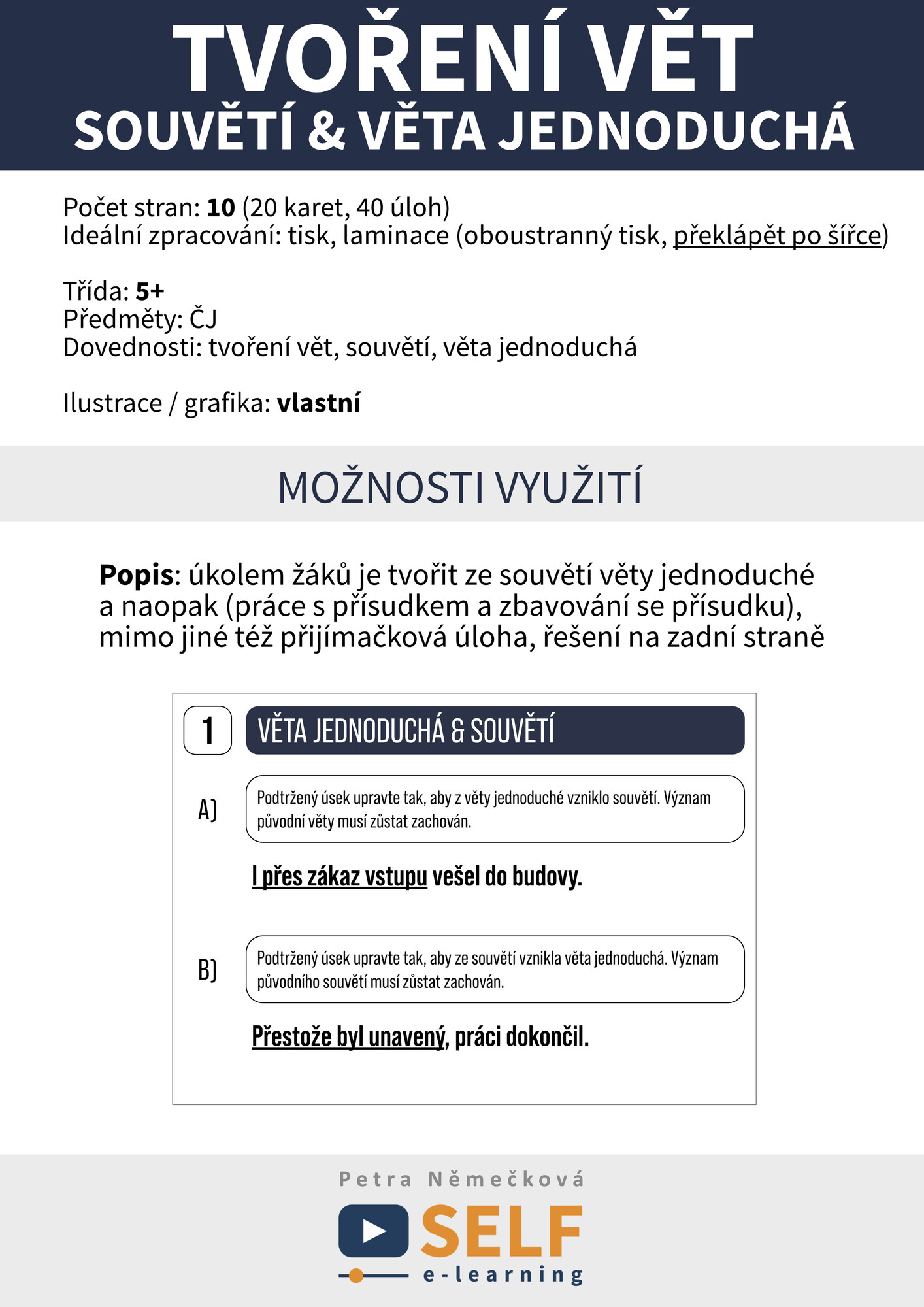 Popis: úkolem žáků je tvořit ze souvětí věty jednoduché a naopak (práce s přísudkem a zbavování se přísudku), mimo jiné též přijímačková úloha, řešení na zadní straně