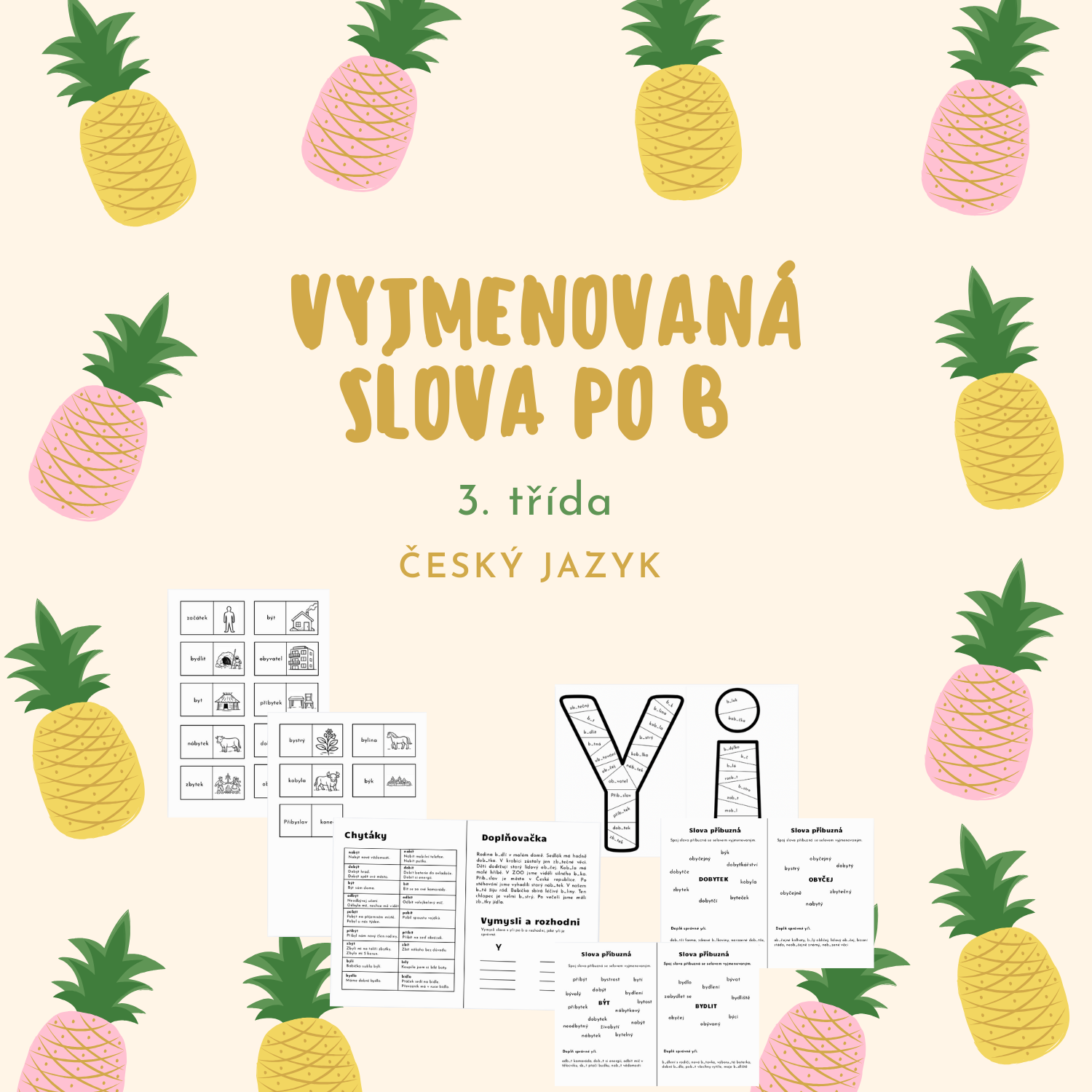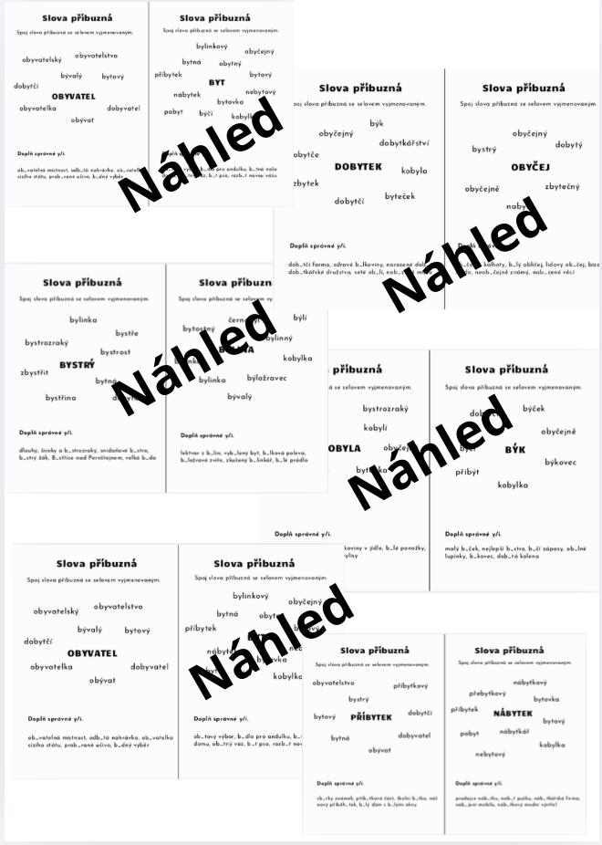 Materiál obsahuje přehled chytáků, doplňovací cvičení a rozhodovanou. Skládačku y a i s vyjmenovanými a slovy, které nejsou vyjmenované po B. Domino na vyjmenovaná slova po B a pracovní listy na slova příbuzná k zapamatování i procvičení.