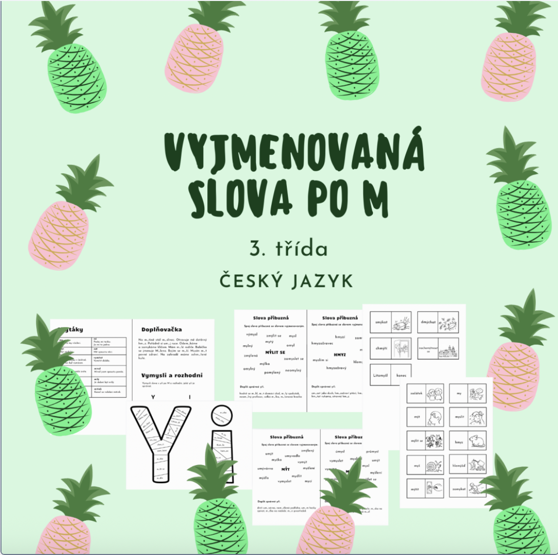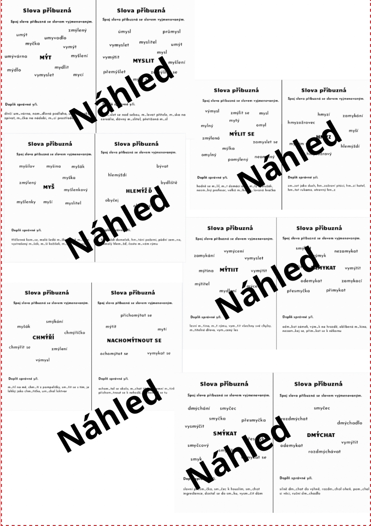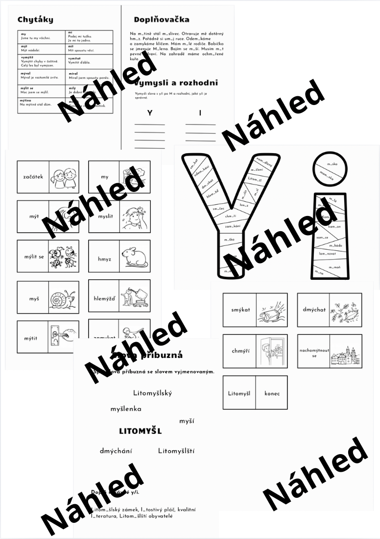 Materiál obsahuje přehled chytáků, doplňovací cvičení a rozhodovačku. Skládačku y a i s vyjmenovanými a slovy, které nejsou vyjmenované po M. Domino na vyjmenovaná slova po M a pracovní listy na slova příbuzná k zapamatování i procvičení.