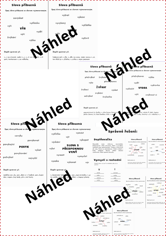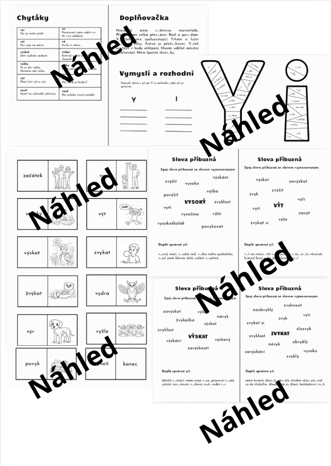 Materiál obsahuje přehled chytáků, doplňovací cvičení a rozhodovačku. Skládačku y a i s vyjmenovanými a slovy, které nejsou vyjmenované po V. Domino na vyjmenovaná slova po V a pracovní listy na slova příbuzná k zapamatování i procvičení.