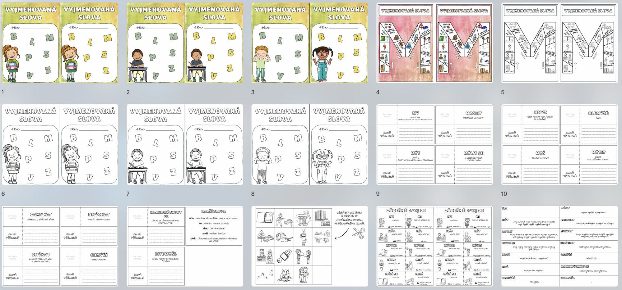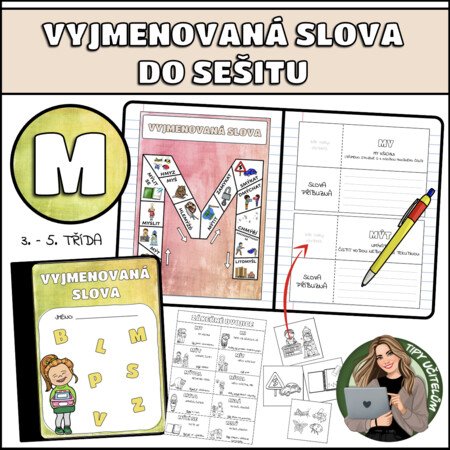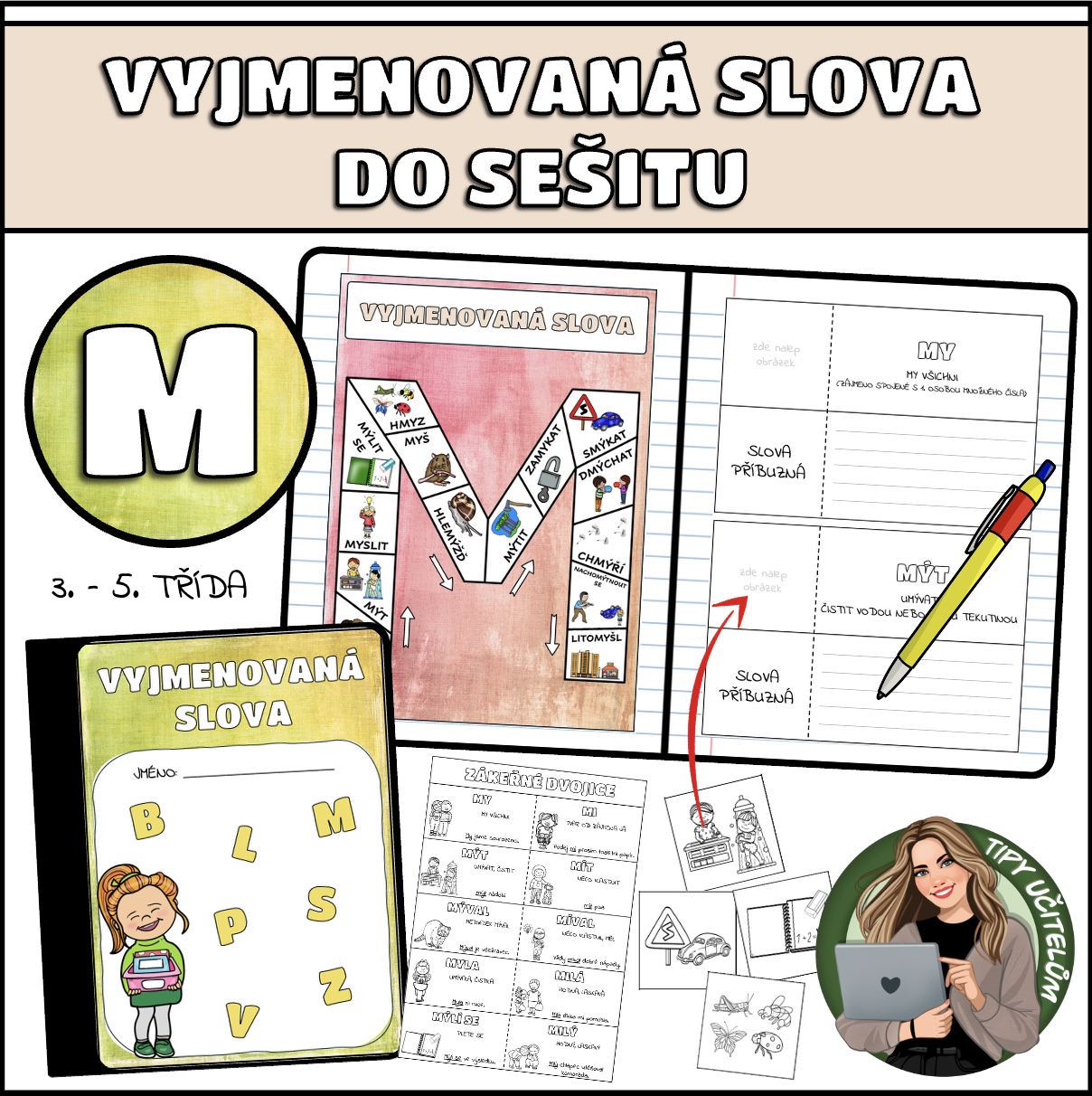 Tento materiál slouží jako přehled vyjmenovaných slov, který si žáci nalepí do sešitu. Jedná se o kompletní set, kde naleznete úvodní stránku k nalepení na desky sešitu, kompletní přehled vyjmenovaných slov, stránky s jednotlivými vyjm. slovy a slovy příbuznými, slova příbuzná, zákeřné dvojice a jednotlivé obrázky, které žáci dolepují ke správnému slovu.