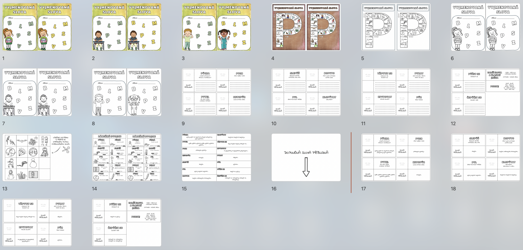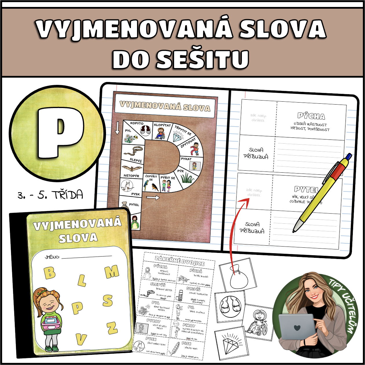 Tento materiál slouží jako přehled vyjmenovaných slov, který si žáci nalepí do sešitu. Jedná se o kompletní set, kde naleznete úvodní stránku k nalepení na desky sešitu, kompletní přehled vyjmenovaných slov, stránky s jednotlivými vyjm. slovy a slovy příbuznými, slova příbuzná, zákeřné dvojice a jednotlivé obrázky, které žáci dolepují ke správnému slovu.