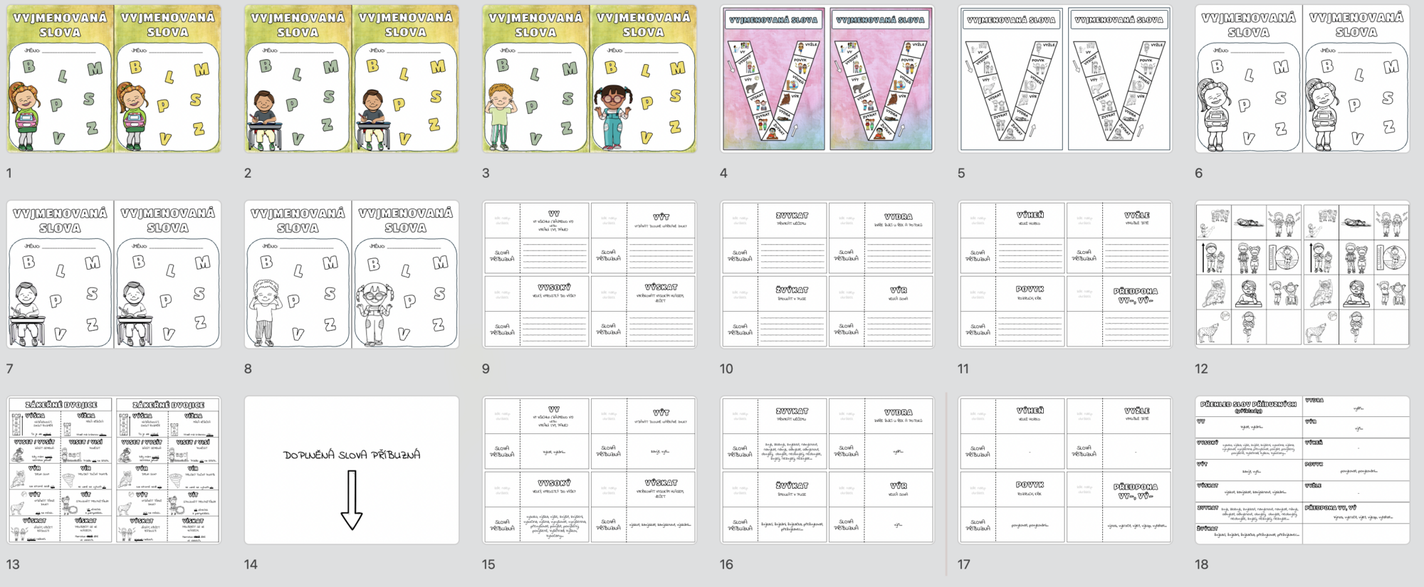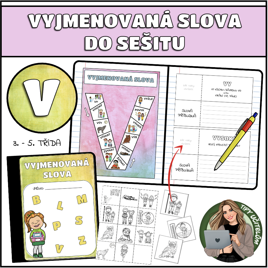 Tento materiál slouží jako přehled vyjmenovaných slov, který si žáci nalepí do sešitu. Jedná se o kompletní set, kde naleznete úvodní stránku k nalepení na desky sešitu, kompletní přehled vyjmenovaných slov, stránky s jednotlivými vyjm. slovy a slovy příbuznými, slova příbuzná