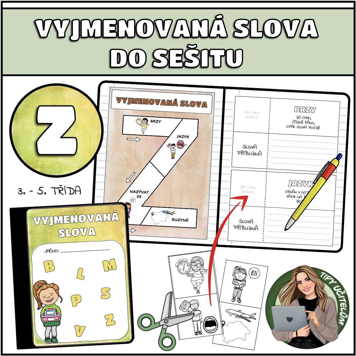 Tento materiál slouží jako přehled vyjmenovaných slov, který si žáci nalepí do sešitu. Jedná se o kompletní set, kde naleznete úvodní stránku k nalepení na desky sešitu, kompletní přehled vyjmenovaných slov, stránky s jednotlivými vyjm. slovy a slovy příbuznými, slova příbuzná a jednotlivé obrázky, které žáci po nastříhání dolepují ke správnému významu slov.