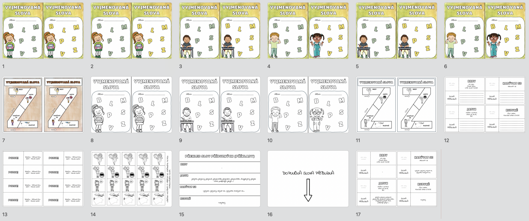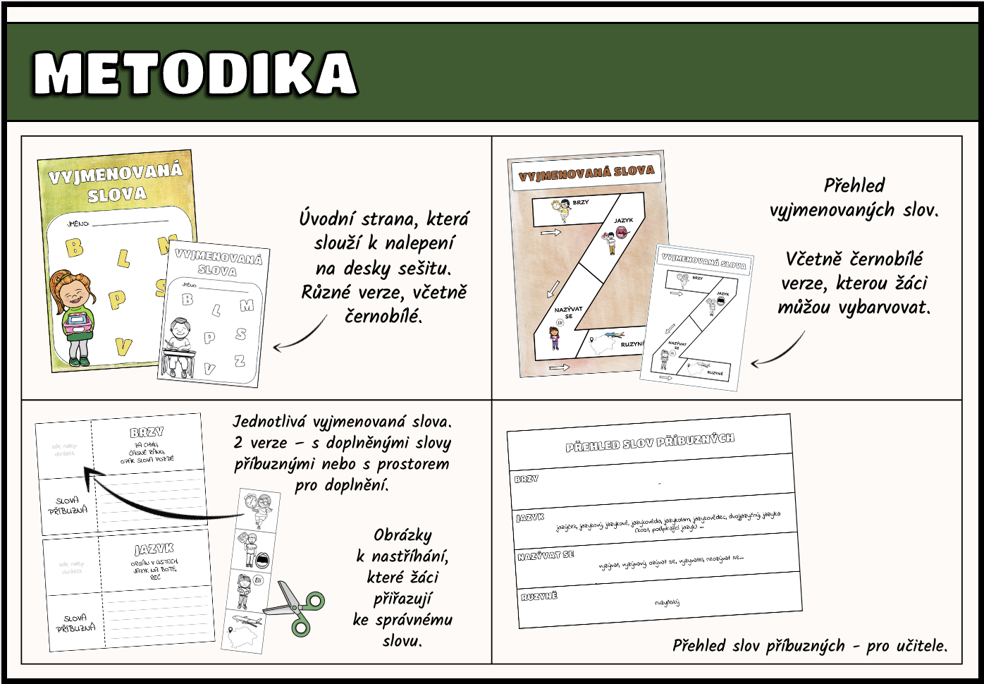 Vše je přizpůsobené na velikost sešitu A5. Díky černobílé verzi děti mohou brát materiál jako omalovánky, což také vede k lepšímu zapamatování si slov.