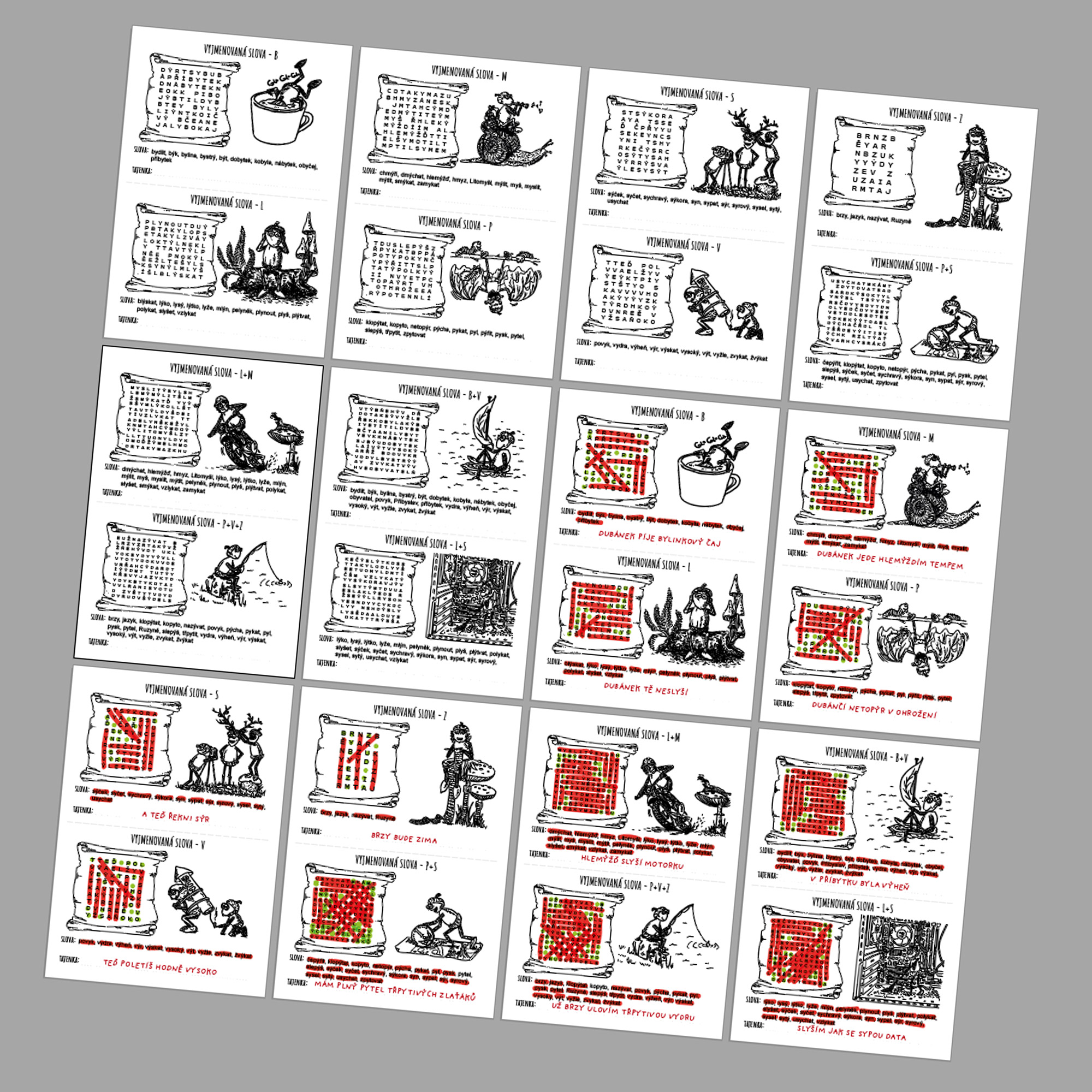 - 5 osmisměrek je větších a obsahují vždy slova ze dvou či tří skupin.
