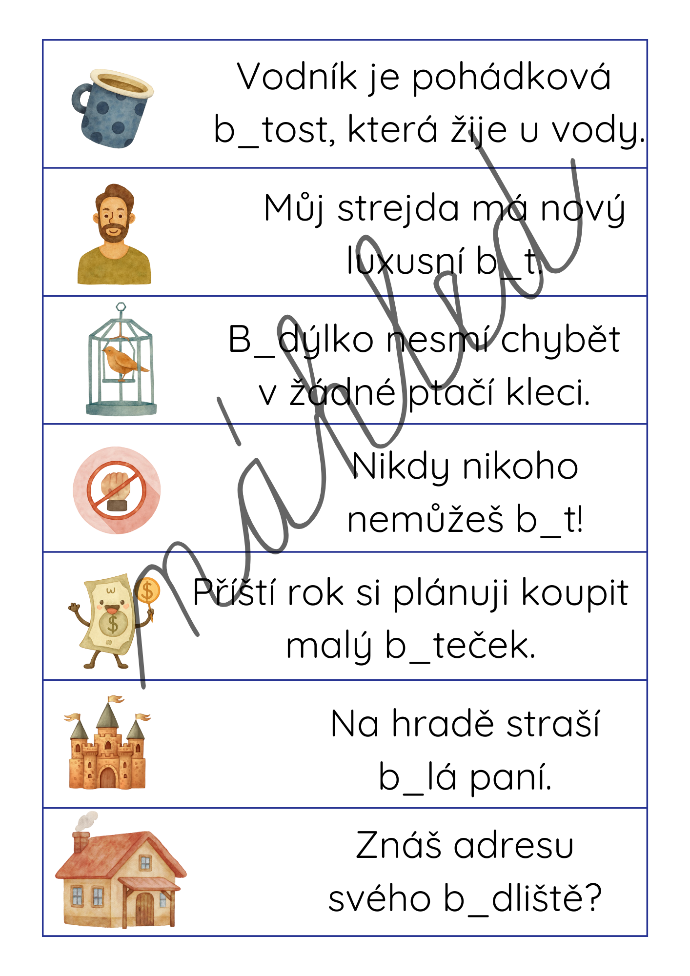 Tento materiál nabízí hravý způsob, jak s dětmi procvičit psaní i/í/y/ý ve slovech odvozených od slovesa BYDLIT, OBYVATEL, BYT.