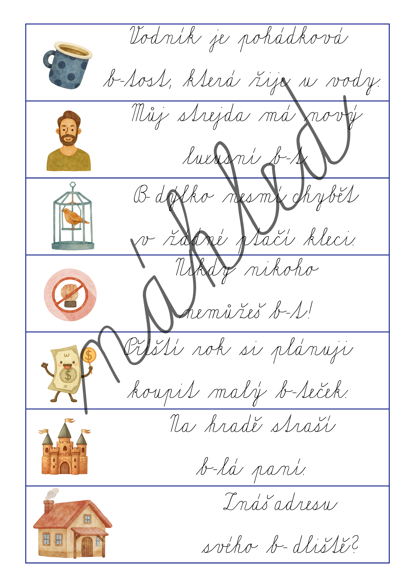 Obsahuje 14 vět v tiskací i psací podobě, které můžete využít k běhacímu diktátu, opisu nebo přepisu.
