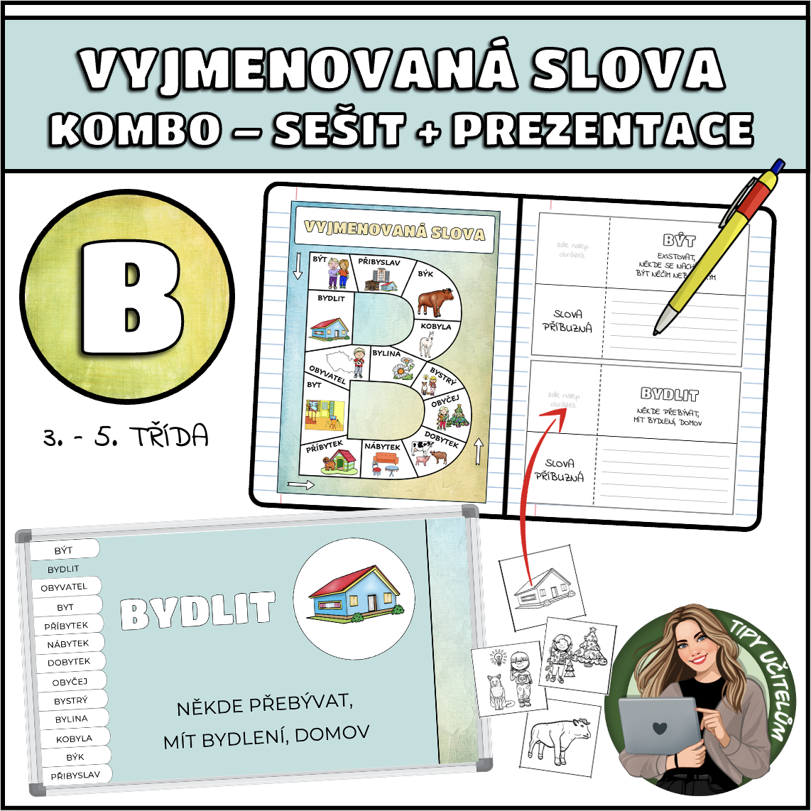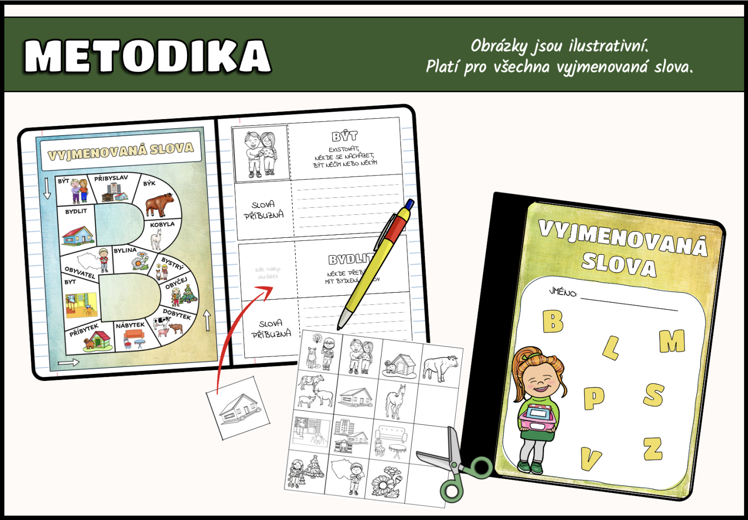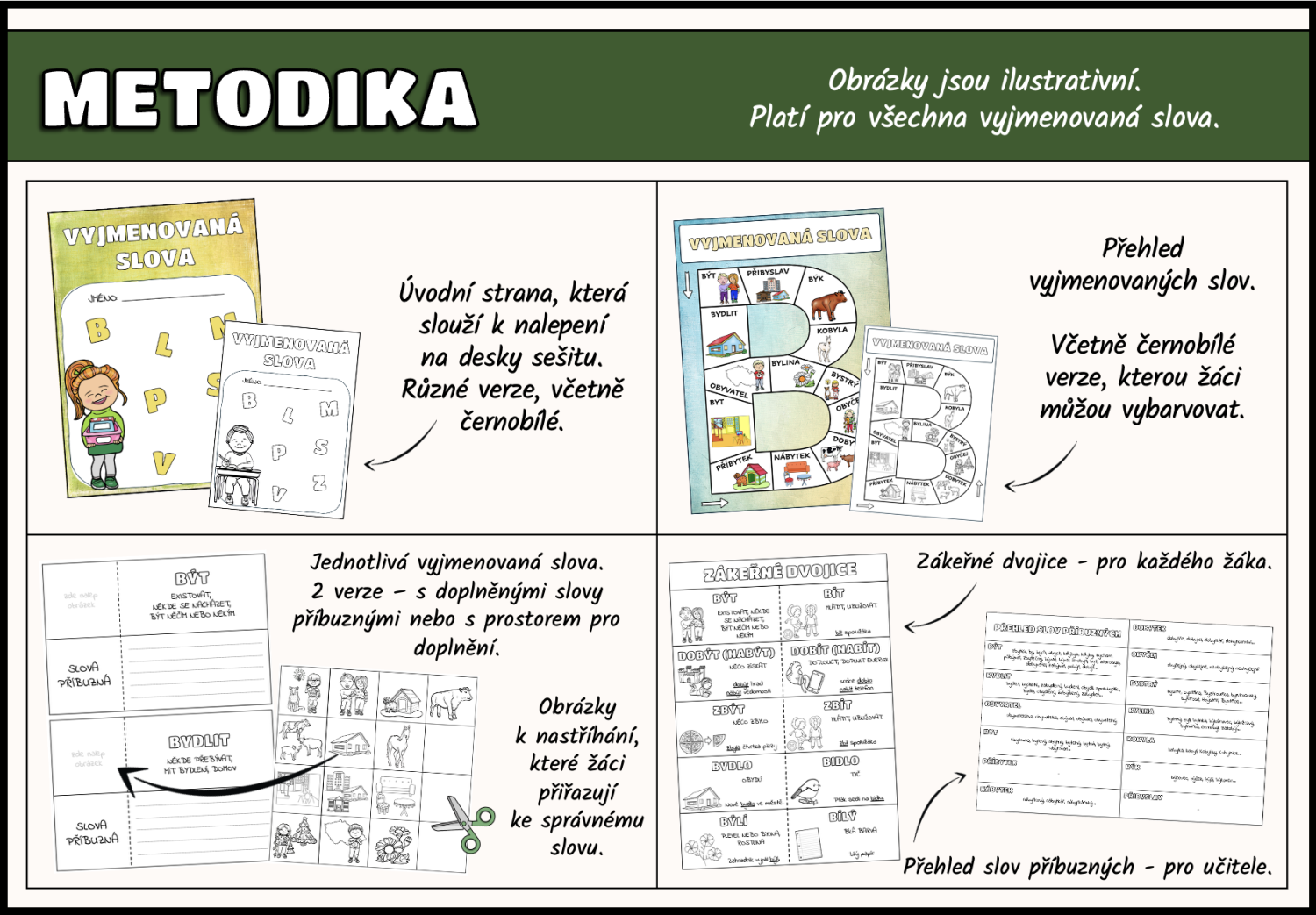Tento materiál slouží jako přehled vyjmenovaných slov, který si žáci nalepí do sešitu. Jedná se o kompletní set, kde naleznete úvodní stránku k nalepení na desky sešitu, kompletní přehled vyjmenovaných slov, stránky s jednotlivými vyjm. slovy a slovy příbuznými, slova příbuzná a jednotlivé obrázky, které žáci po nastříhání dolepují ke správnému významu slov.