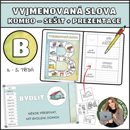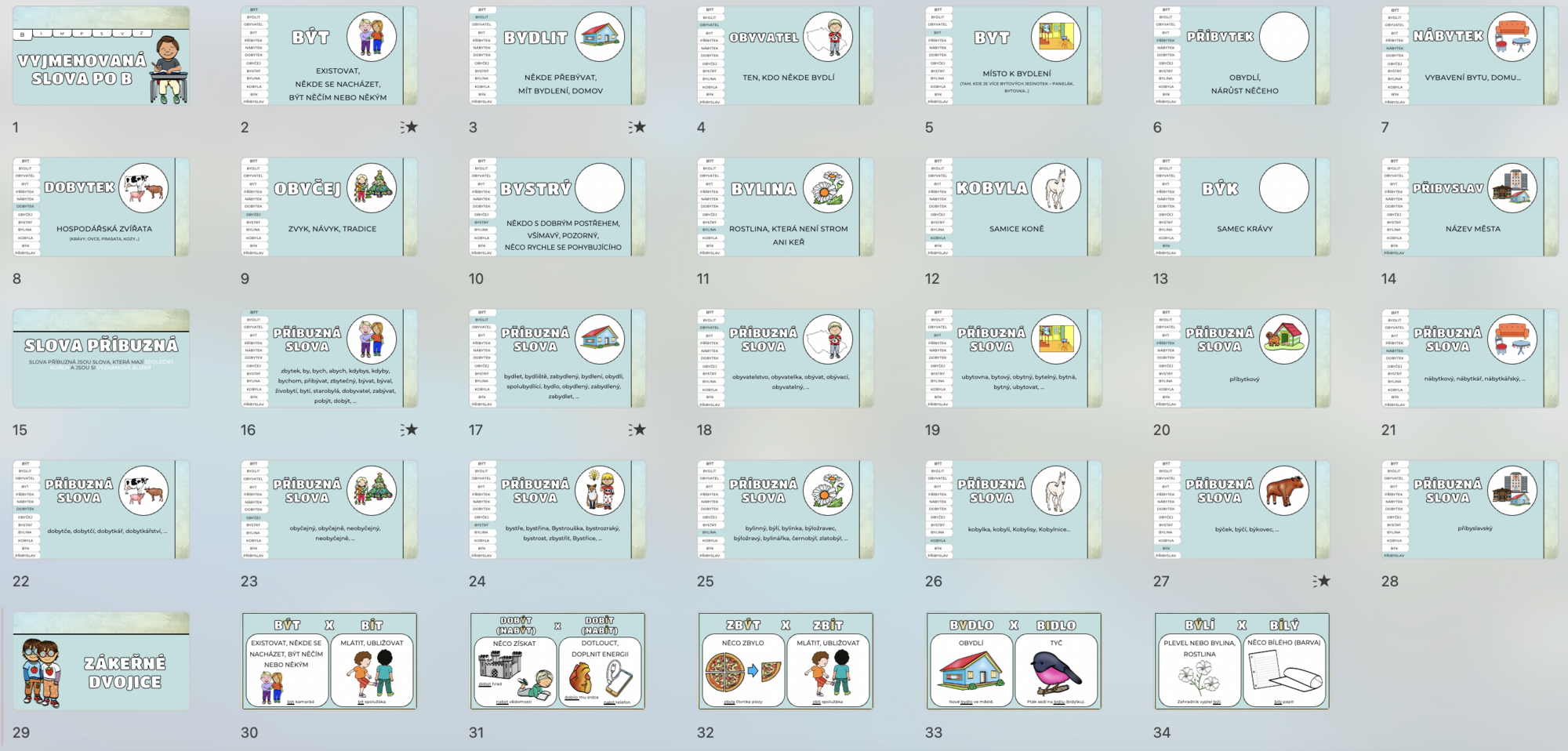Prezentace k výuce vyjmenovaných slov po B. Obsahuje název, obrázek, vysvětlení slova, slova příbuzná, popřípadě výjimky či zákeřné dvojice.