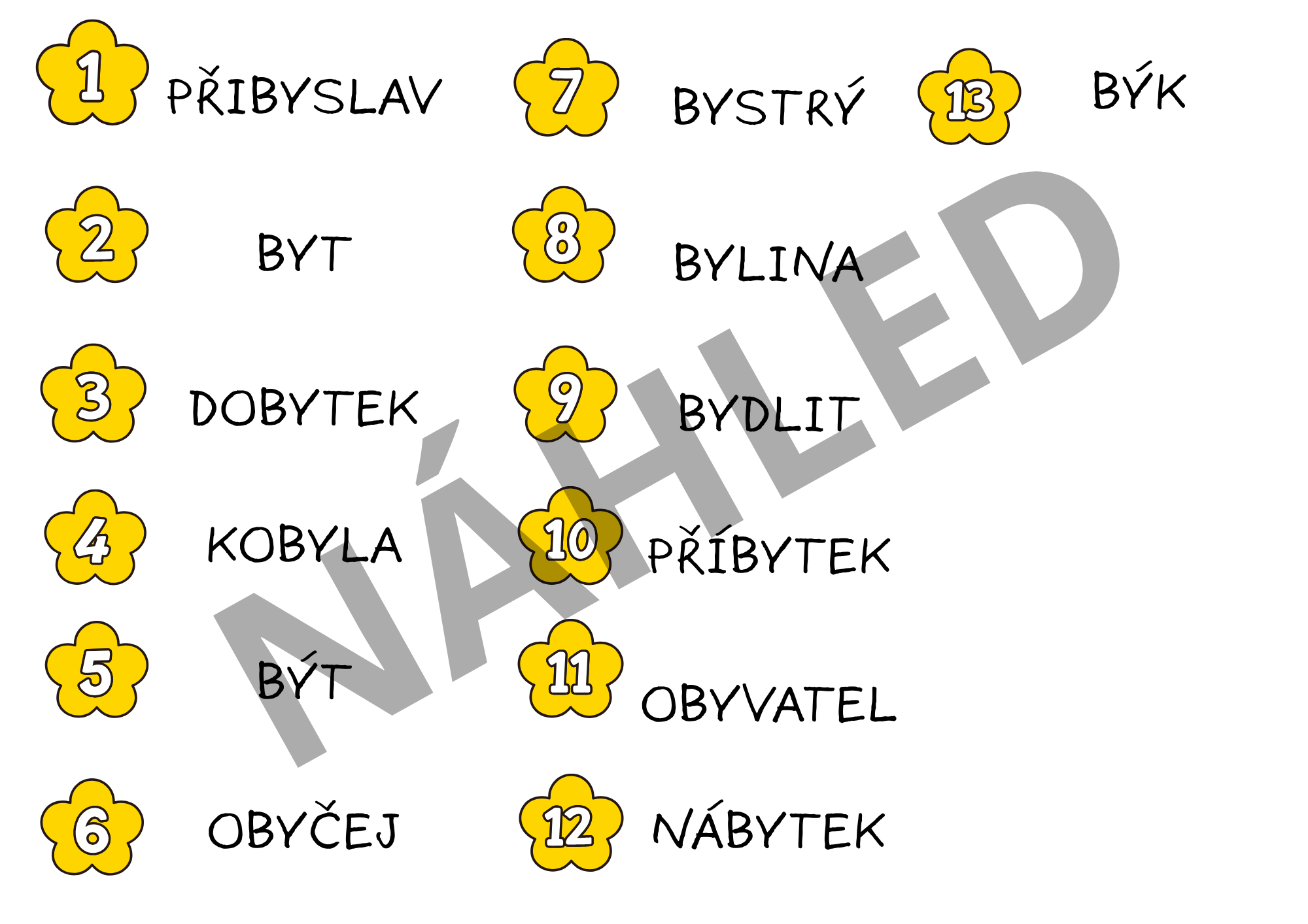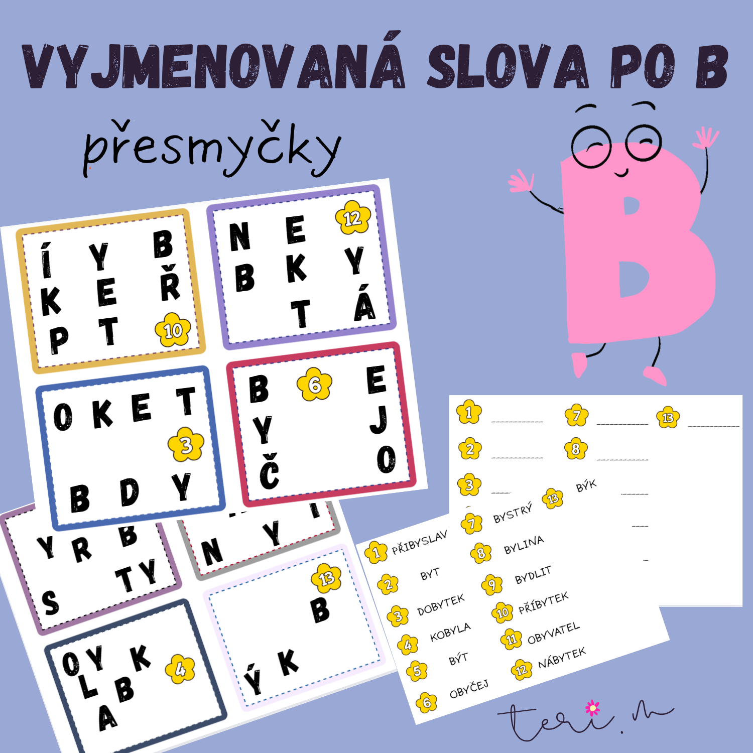 - 13 kartiček s přesmyčkami k vyjmenovaným slovům po B,