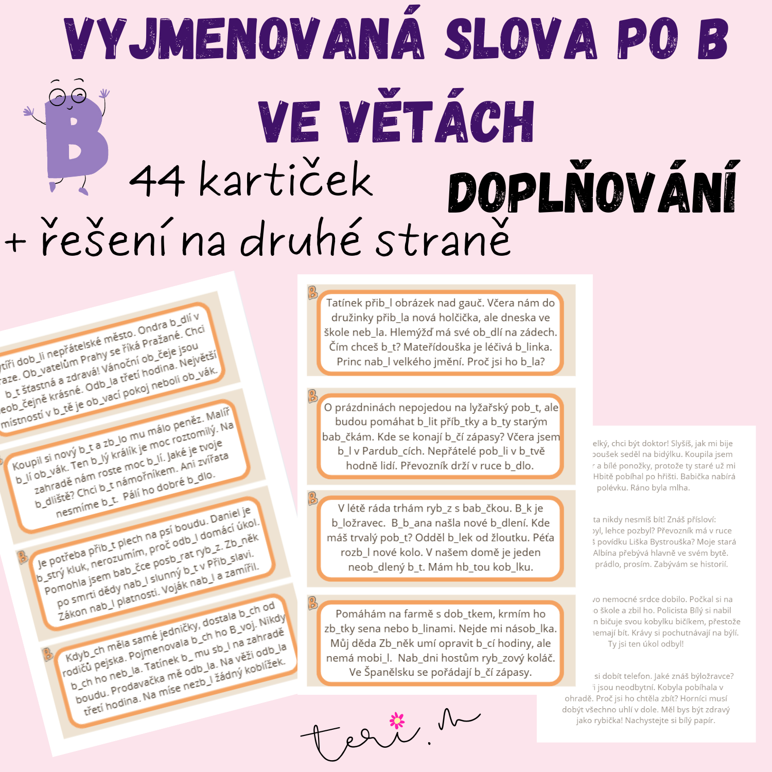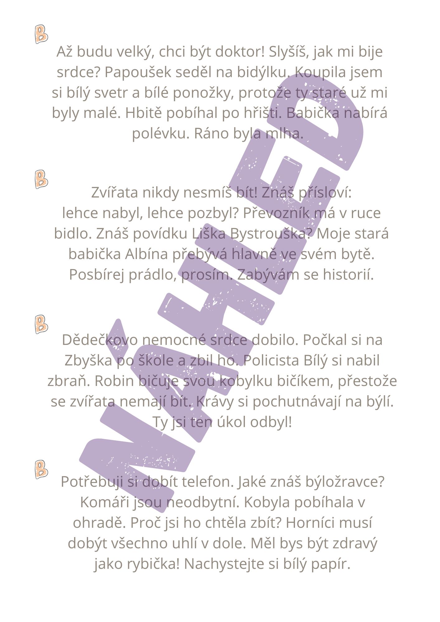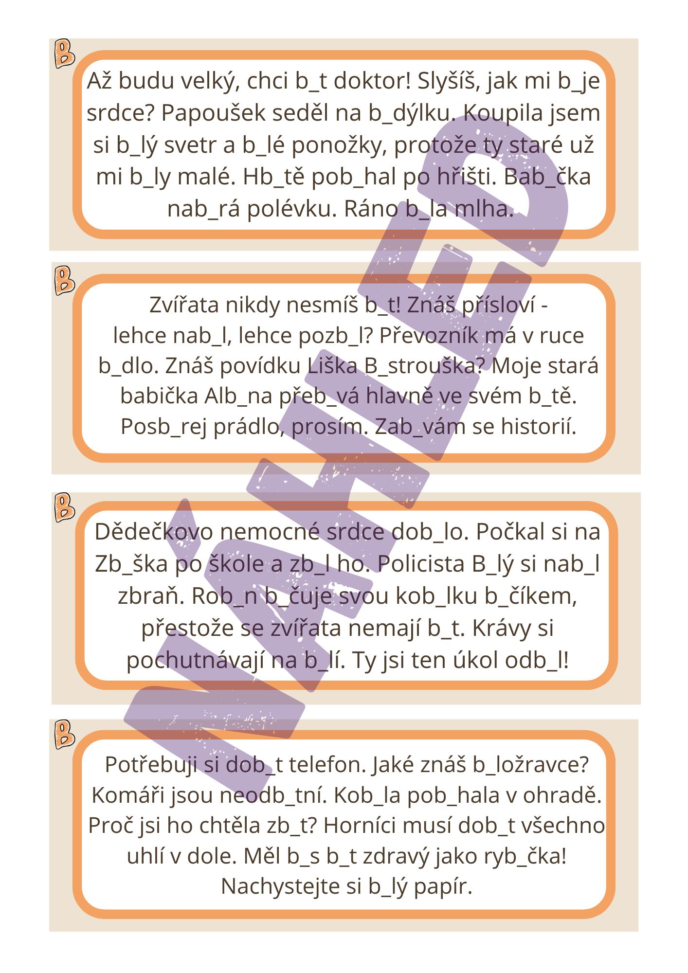 Tento materiál obsahuje 44 kartiček s větami, ve kterých se procvičují vyjmenovaná a příbuzná slova po B.