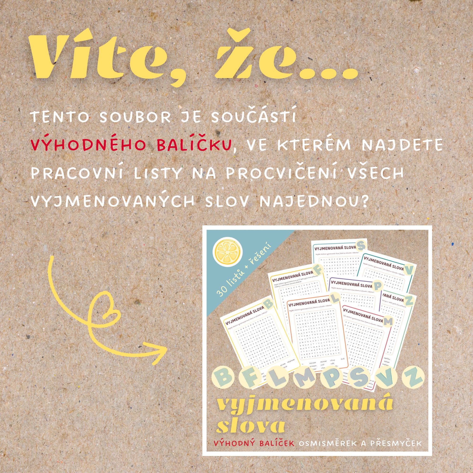 🟢Víte, že tento soubor je součástí VÝHODNÉHO BALÍČKU, ve kterém najdete pracovní listy na procvičení všech vyjmenovaných slov najednou? Pořídit si je ale můžete i jednotlivě, mrkněte na naše soubory s vyjmenovanými slovy po B, po L, po M, po P, po S a po V.