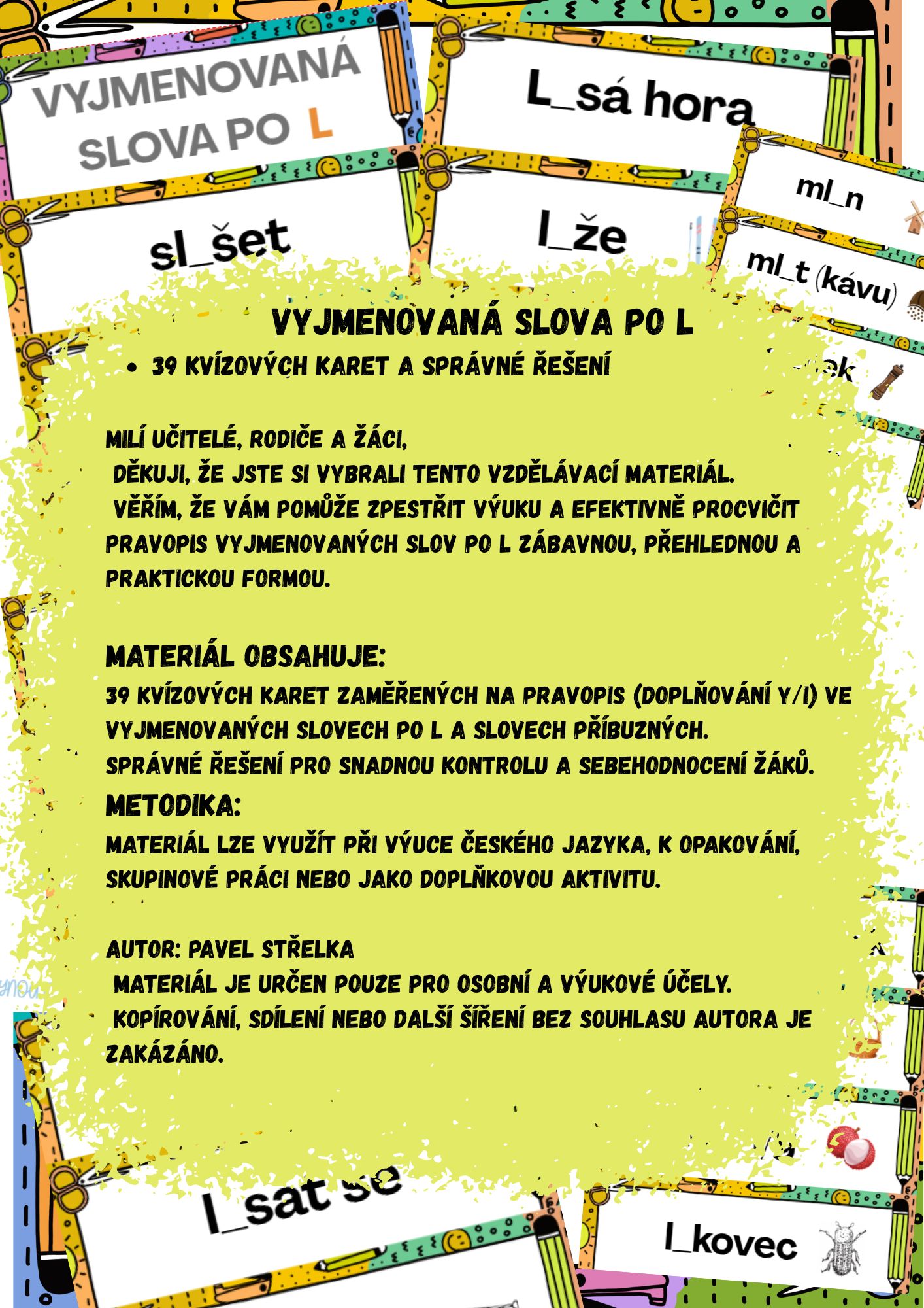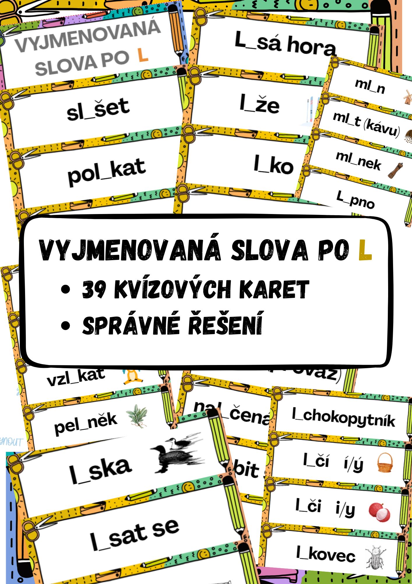 39 kvízových karet zaměřených na pravopis (doplňování Y/I) ve vyjmenovaných slovech po L a slovech příbuzných. Správné řešení pro snadnou kontrolu a sebehodnocení žáků.