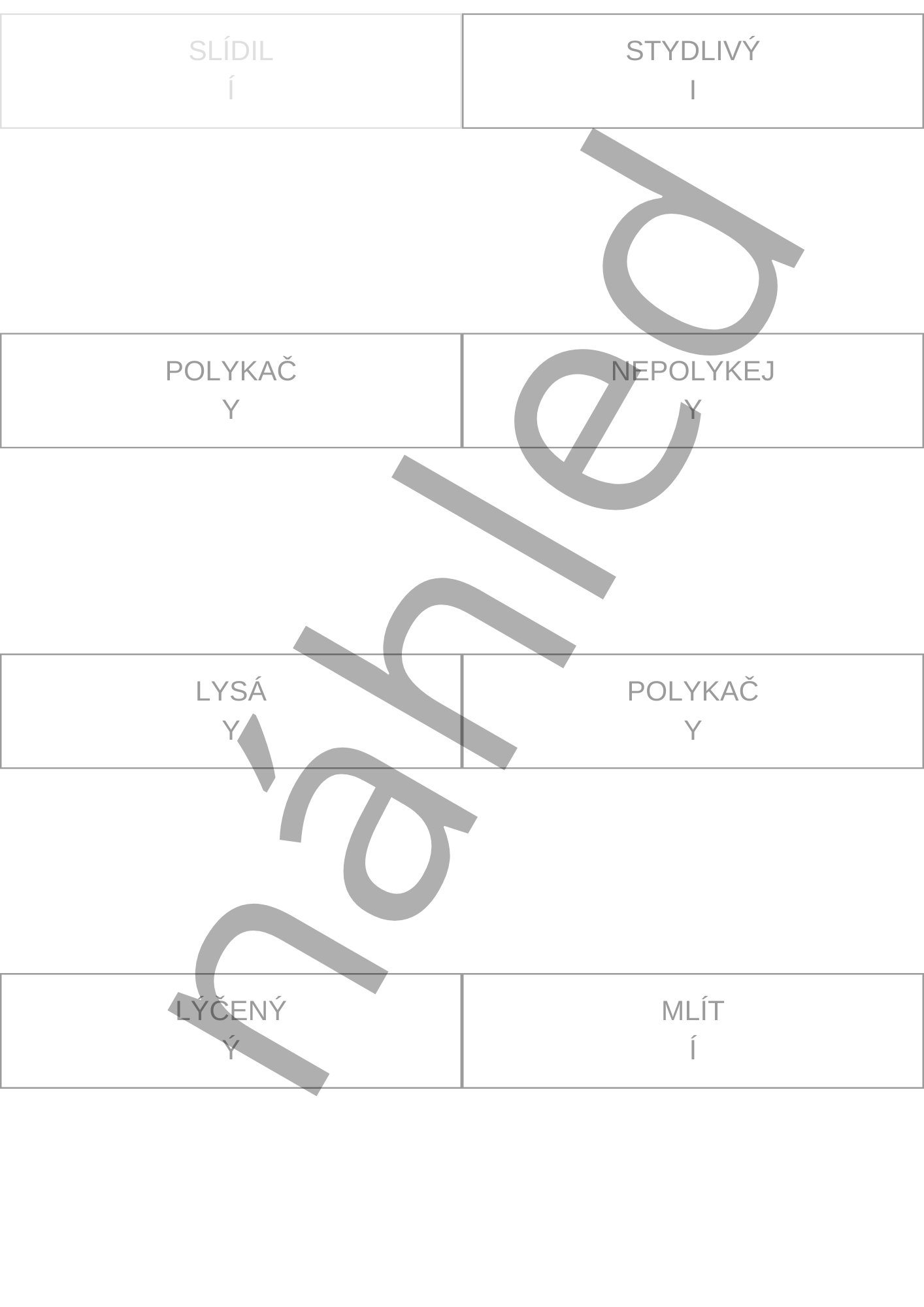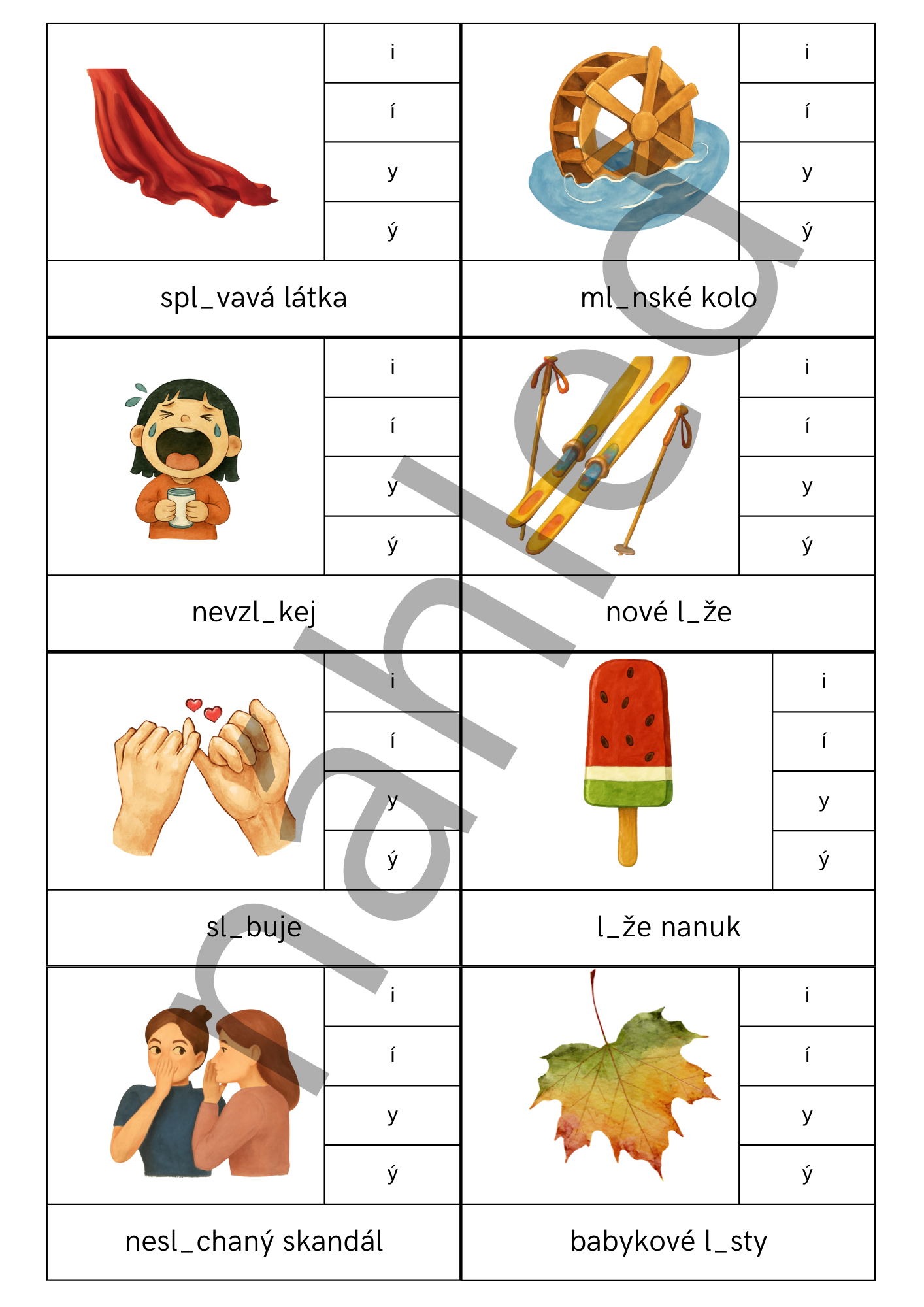 Úkolem žáků je vybrat správnou možnost (i/í/y/ý) pomocí kolíčku. Při oboustranném tisku je na zadní straně kartiček řešení – ideální pro samostatnou práci a sebekontrolu.