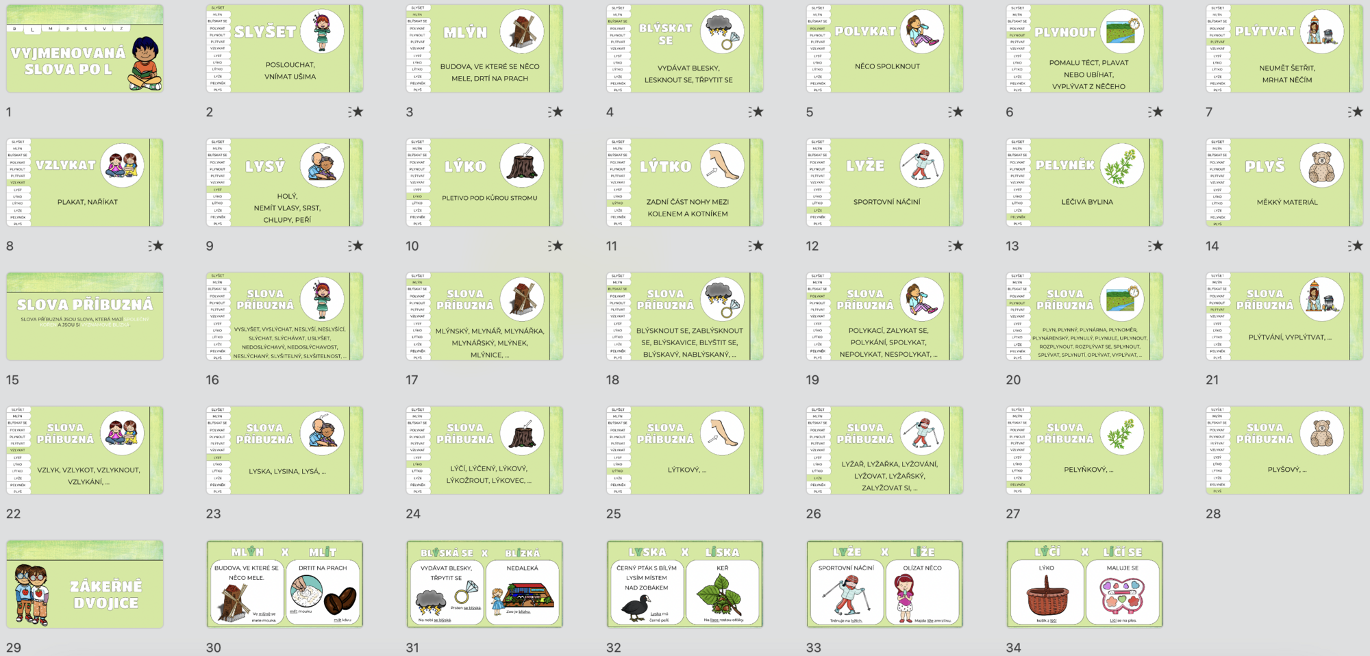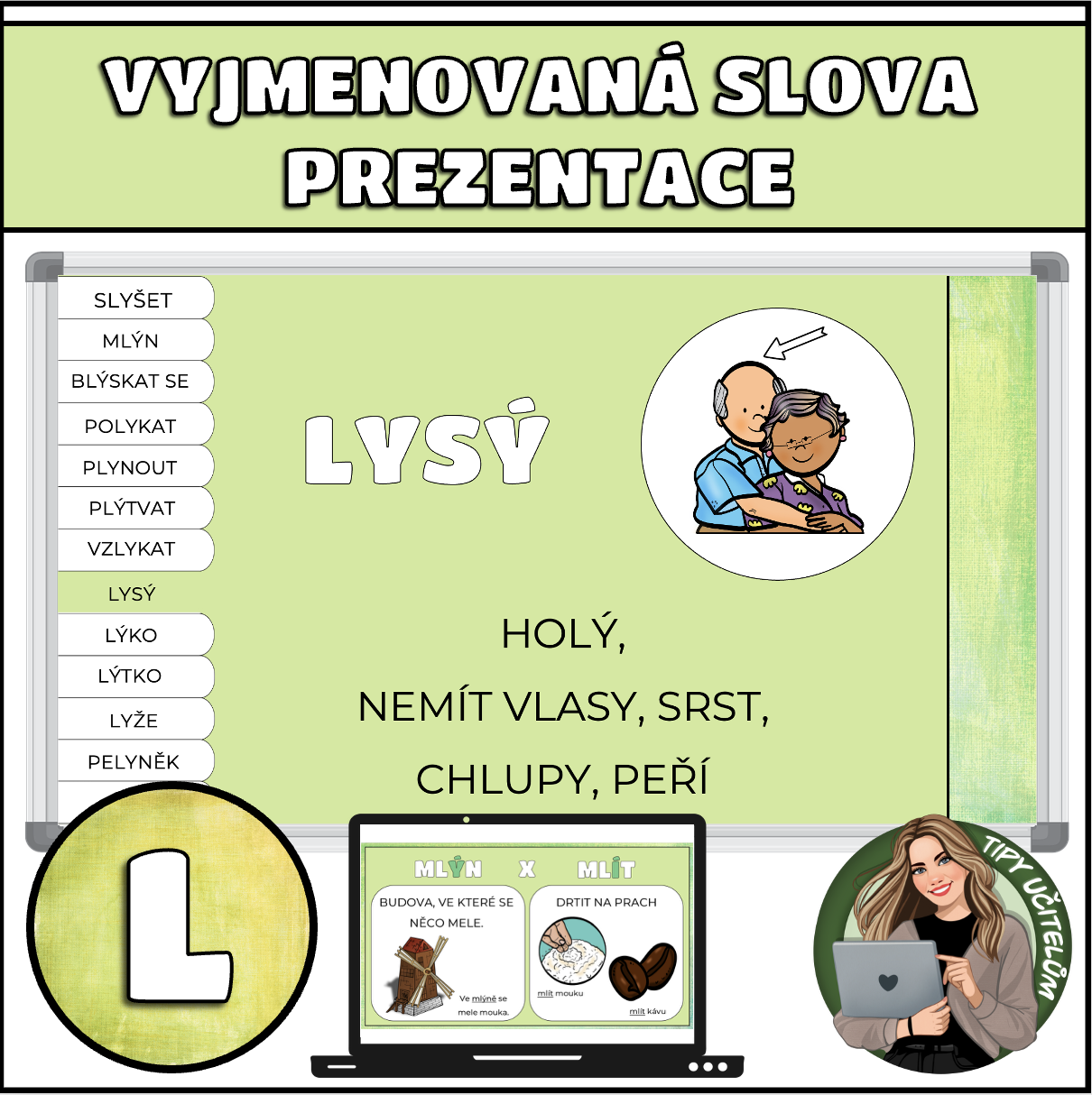 Prezentace k výuce vyjmenovaných slov po L. Obsahuje název, obrázek, vysvětlení slova, slova příbuzná a zákeřné dvojice (mlýn vs mlín...)