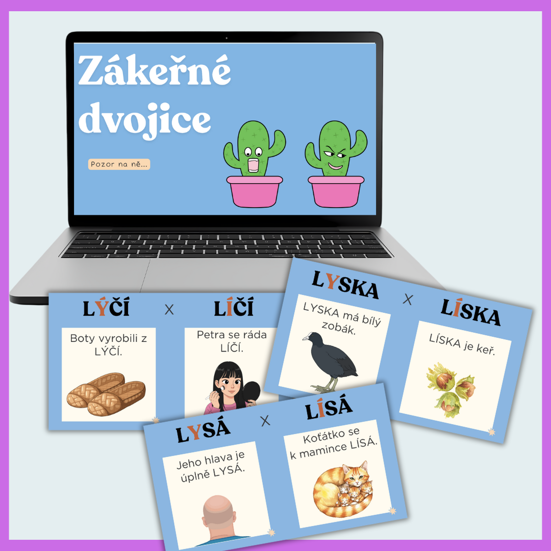 - také tzv. „zákeřné dvojice“ (např. lyska × líska, lysá × lísa...), které pomáhají žákům rozlišit často zaměňovaná slova,