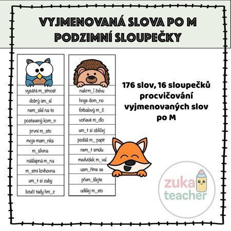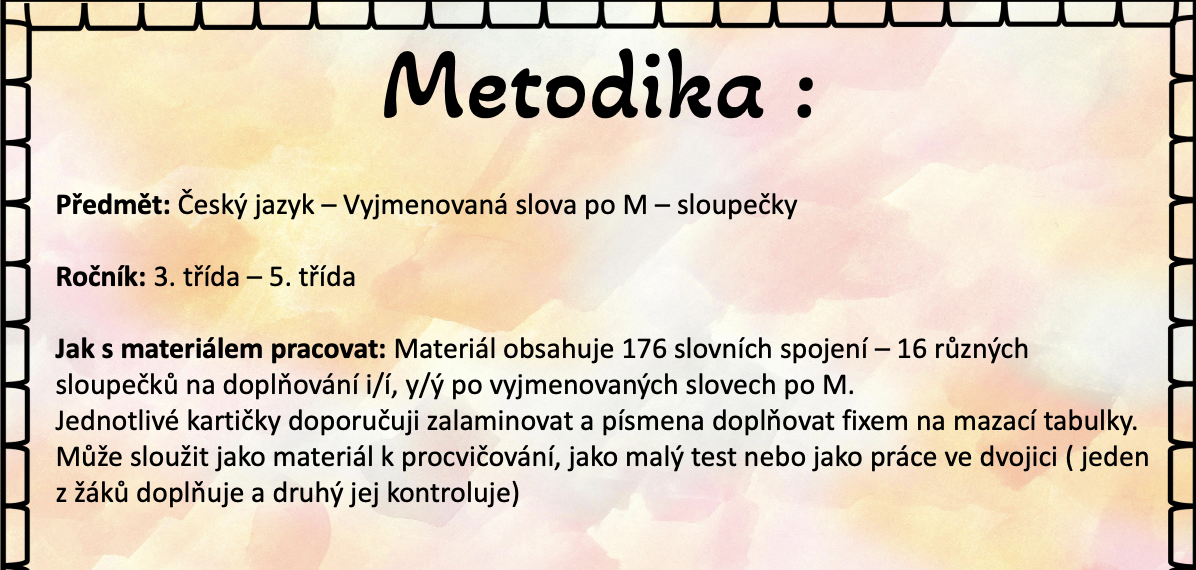 Materiál obsahuje 176 slovních spojení – 16 různých sloupečků na doplňování i/í, y/ý po vyjmenovaných slovech po M.