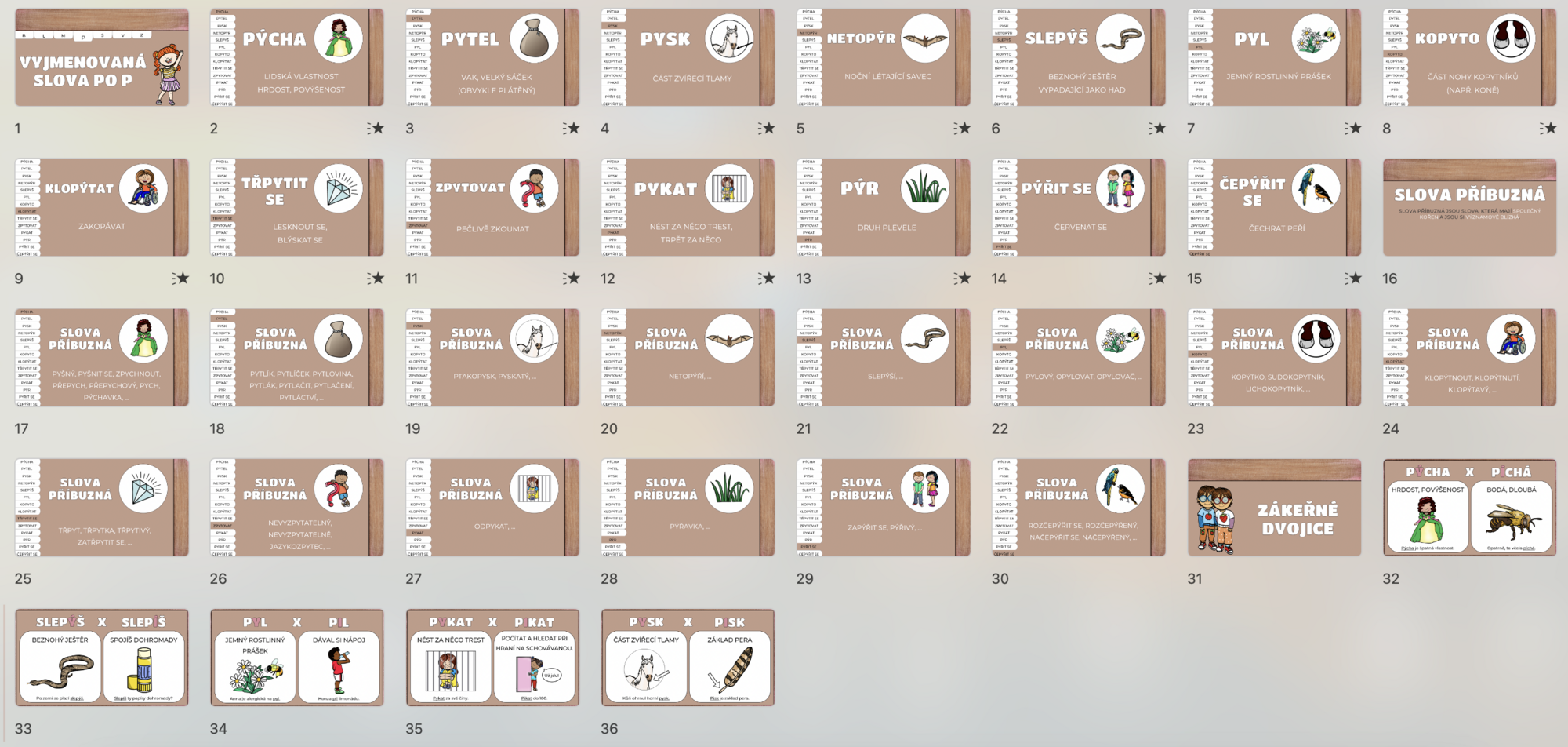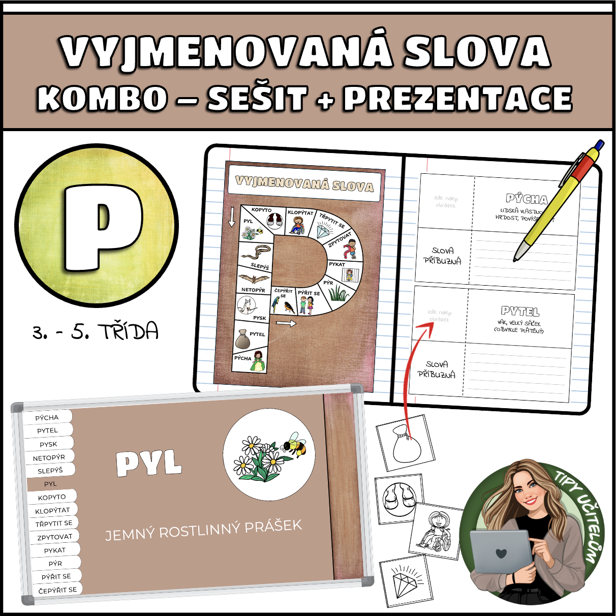 Tento materiál slouží jako přehled vyjmenovaných slov, který si žáci nalepí do sešitu. Jedná se o kompletní set, kde naleznete úvodní stránku k nalepení na desky sešitu, kompletní přehled vyjmenovaných slov, stránky s jednotlivými vyjm. slovy a slovy příbuznými, slova příbuzná a jednotlivé obrázky, které žáci po nastříhání dolepují ke správnému významu slov.
