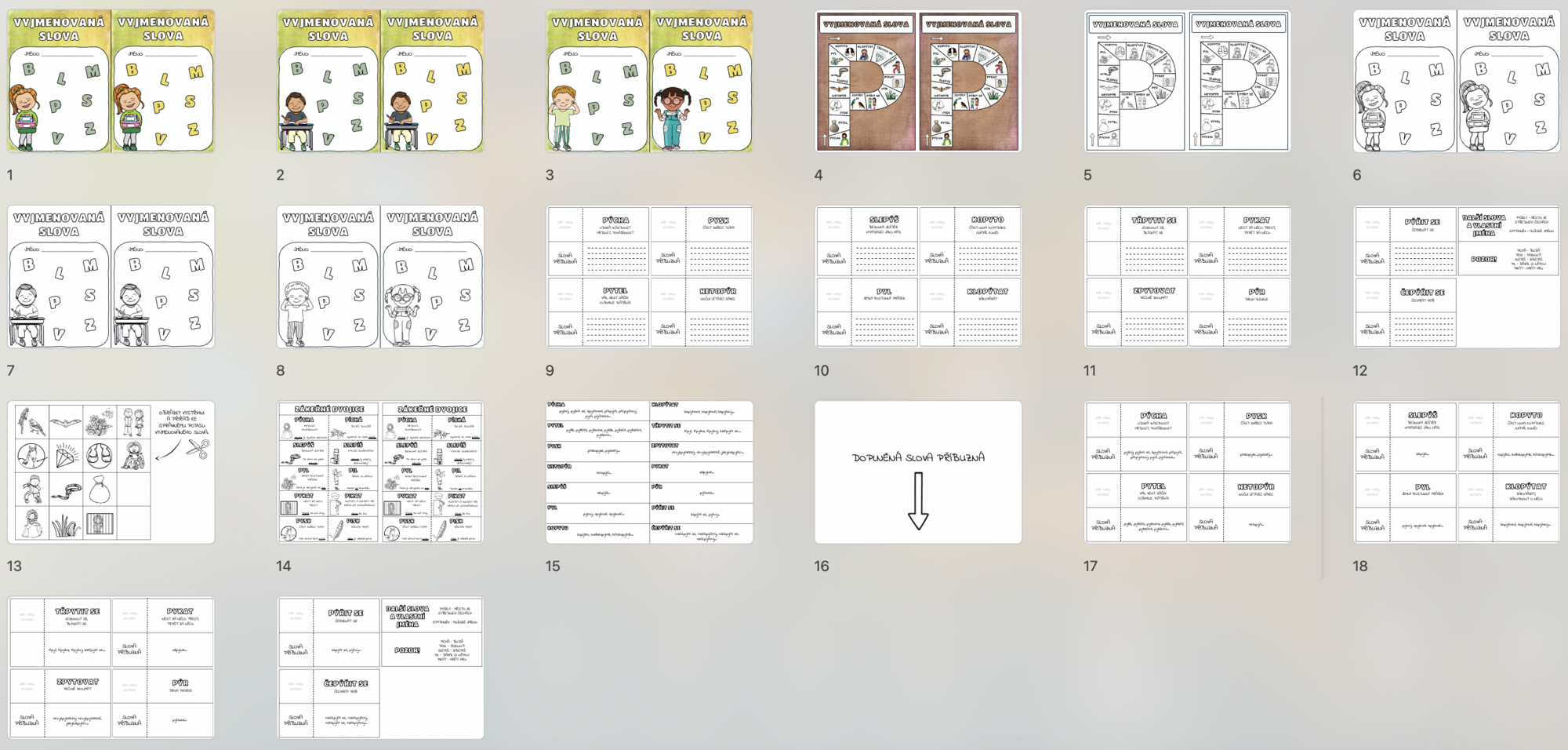 Vše je přizpůsobené na velikost sešitu A5 - 60 listů. Díky černobílé verzi děti mohou brát materiál jako omalovánky, což také vede k lepšímu zapamatování si slov.