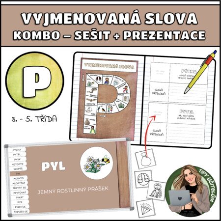 Prezentace k výuce vyjmenovaných slov po P. Obsahuje název, obrázek, vysvětlení slova, slova příbuzná, popřípadě výjimky či zákeřné dvojice.