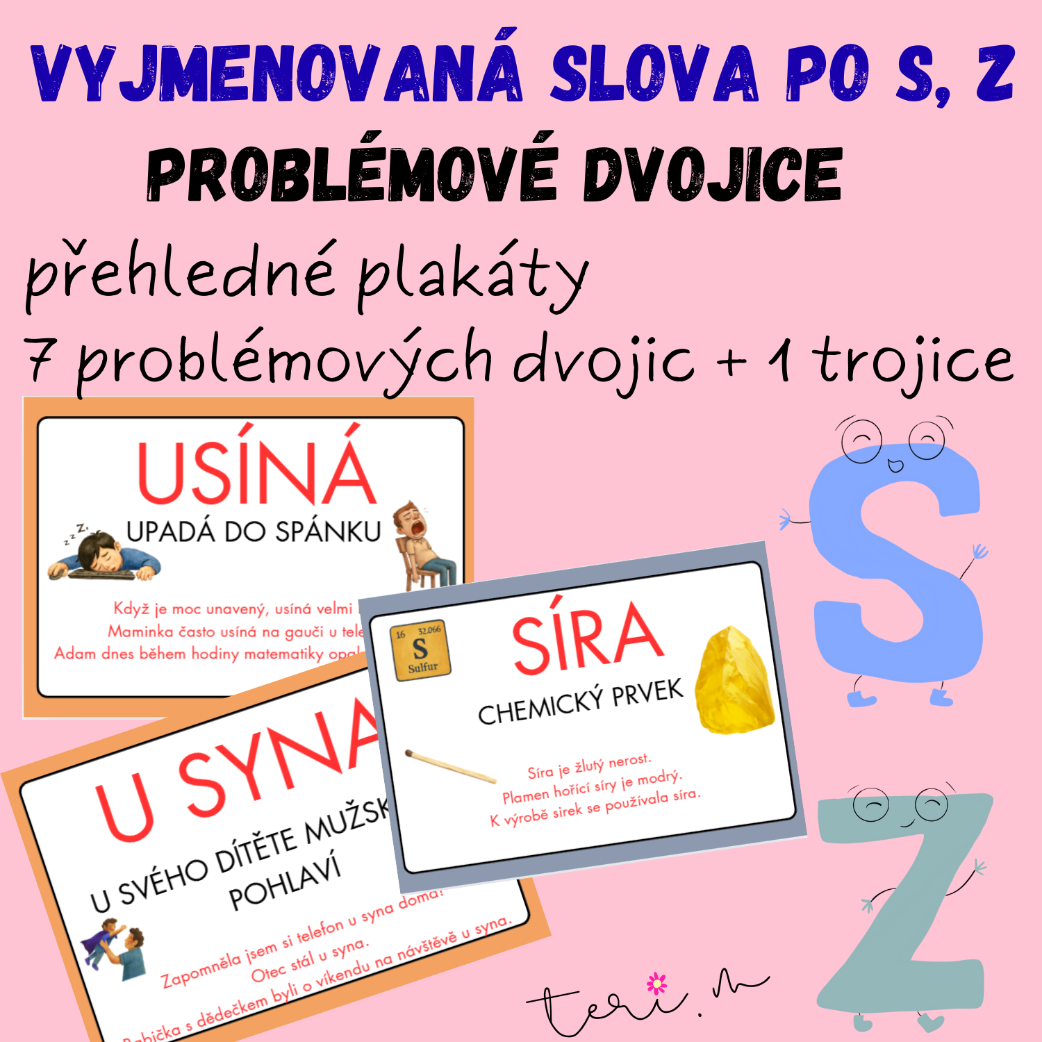 Tento přehledný a vizuálně poutavý materiál obsahuje pět nejčastějších problémových dvojic slov a jednu trojici, které si žáci často pletou při práci s vyjmenovanými slovy po S a dvě dvojice pro vyjmenovaná slova po Z.