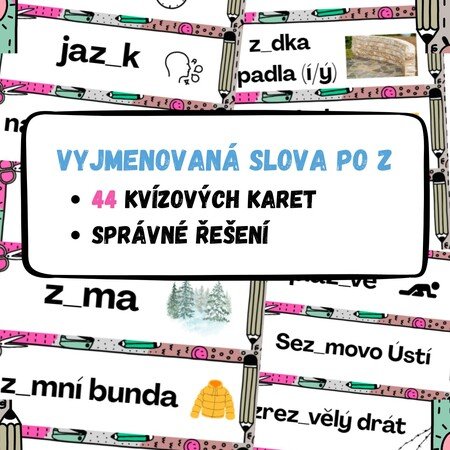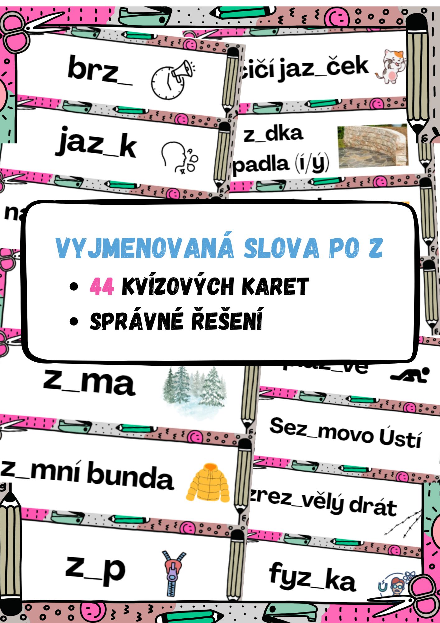 Obsah materiálu: 44 výukových karet zaměřených na pravopis (doplňování y/i, ý/í) ve vyjmenovaných slovech po Z a slovech příbuzných. Správné řešení pro snadnou kontrolu a sebehodnocení žáků.