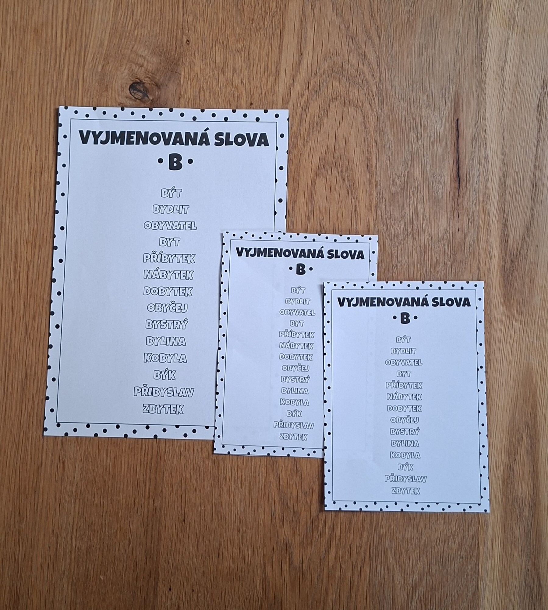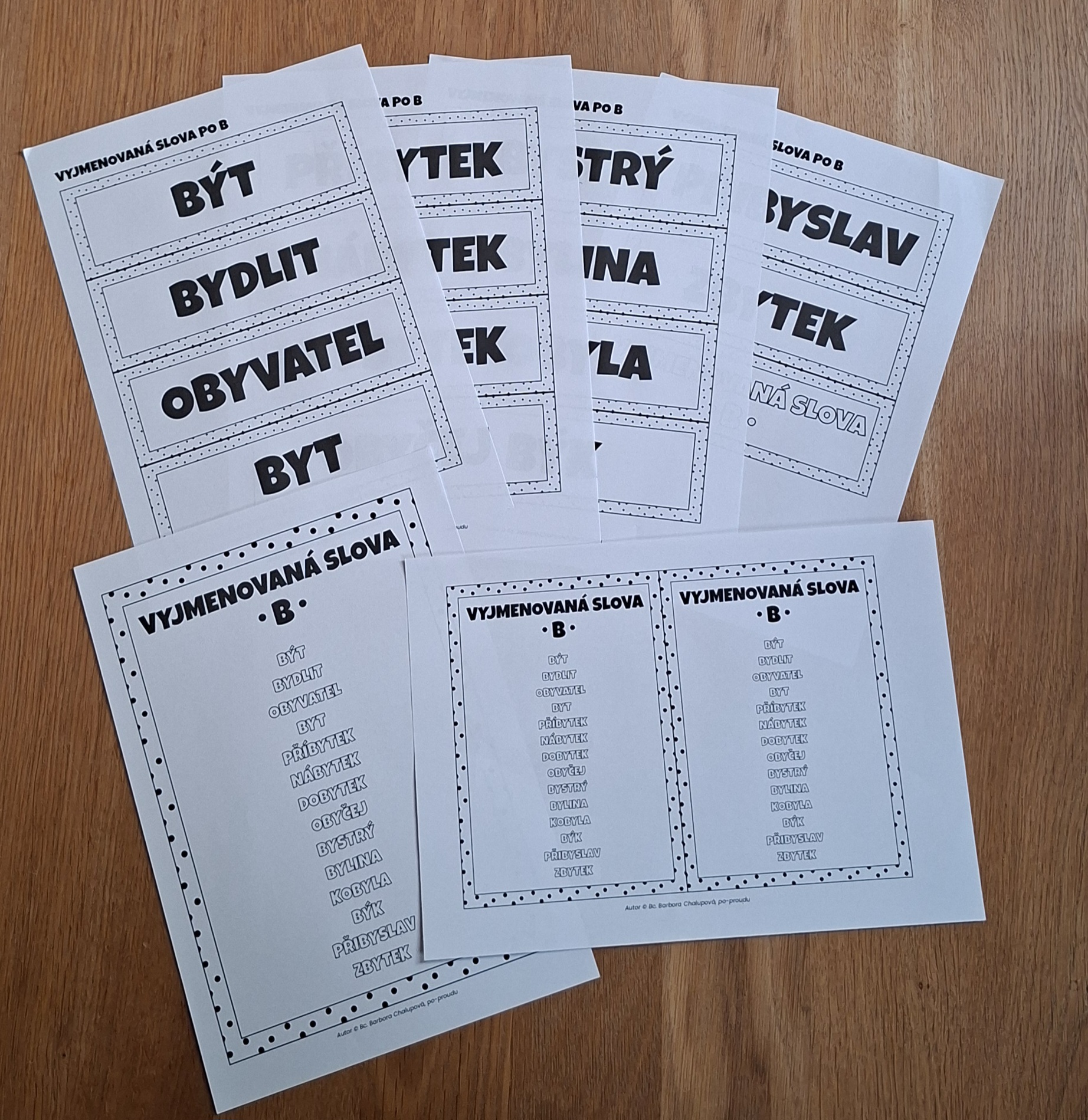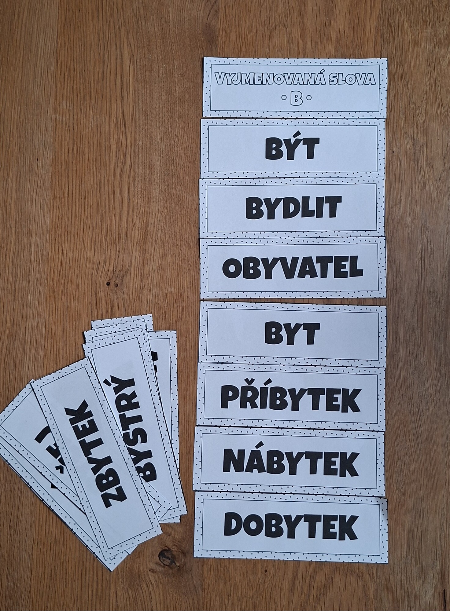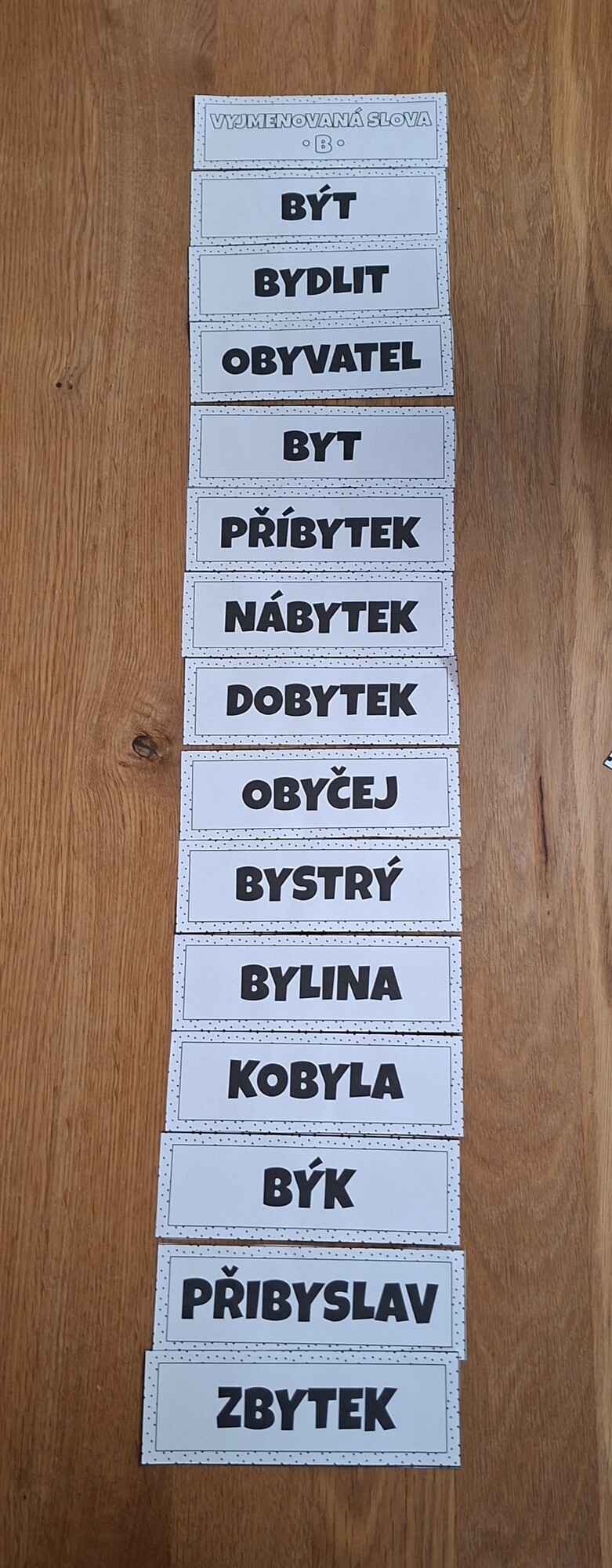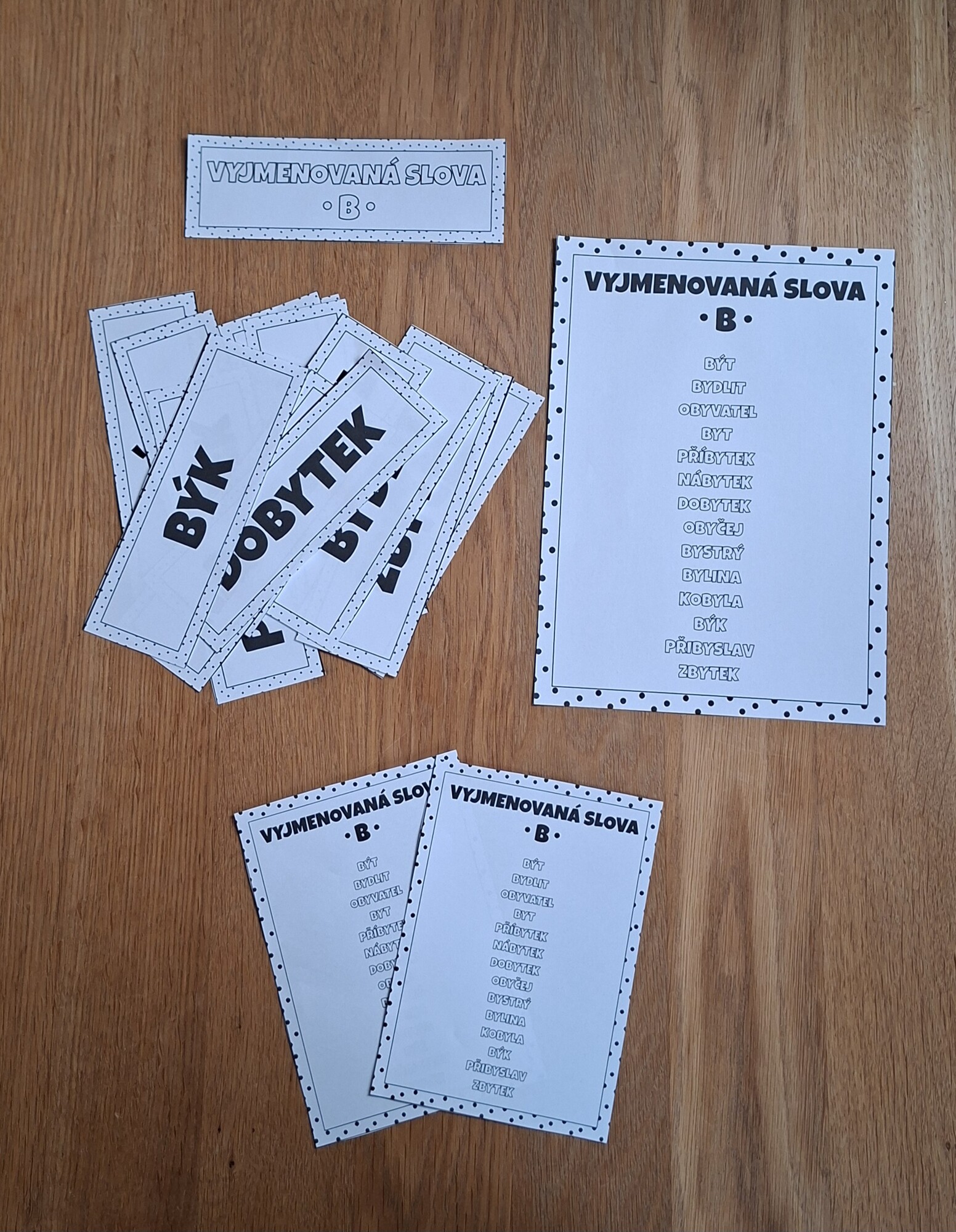 - kartičky s vyjmenovanými slovy – vhodné k výzdobě třídy, třídění nebo práci ve skupinkách,