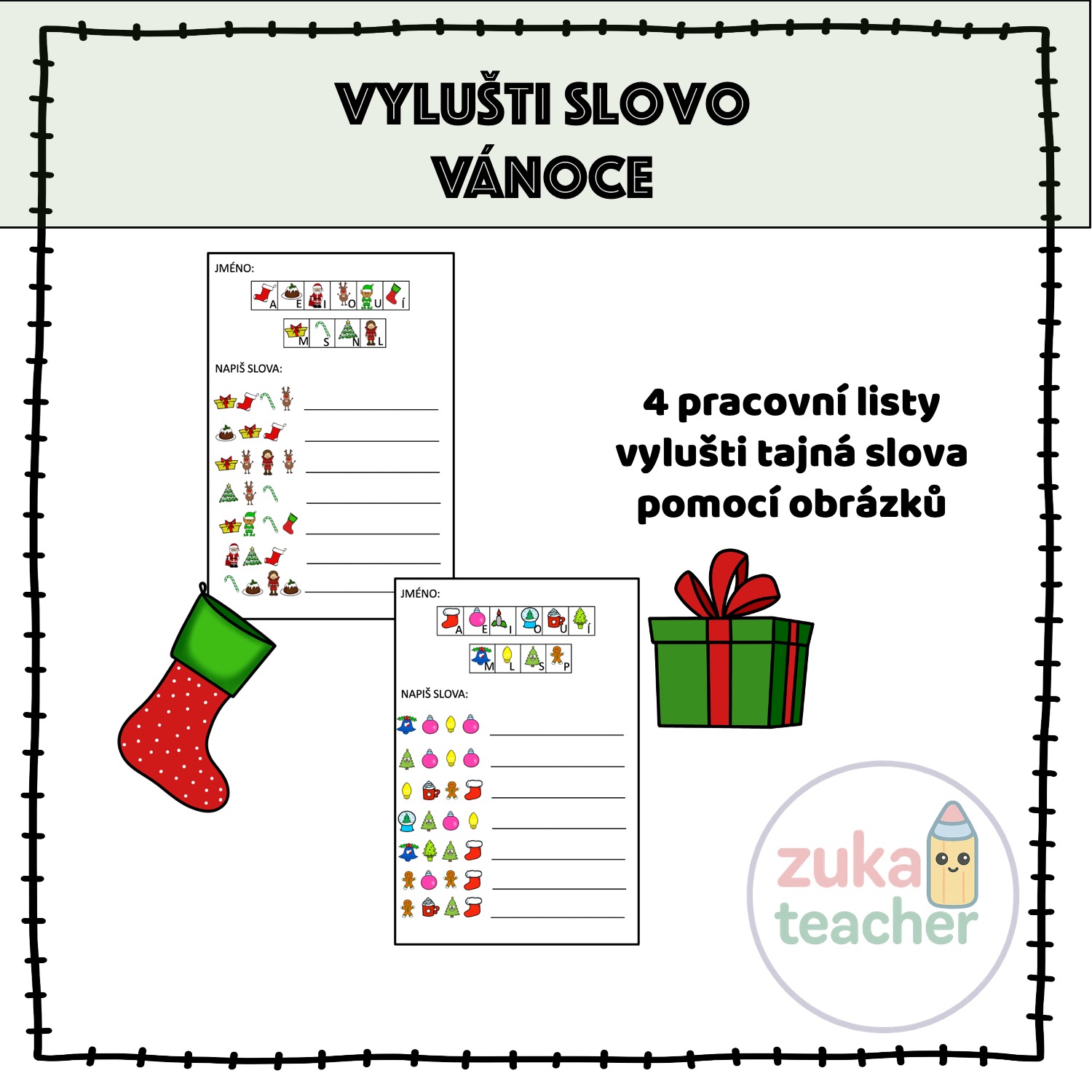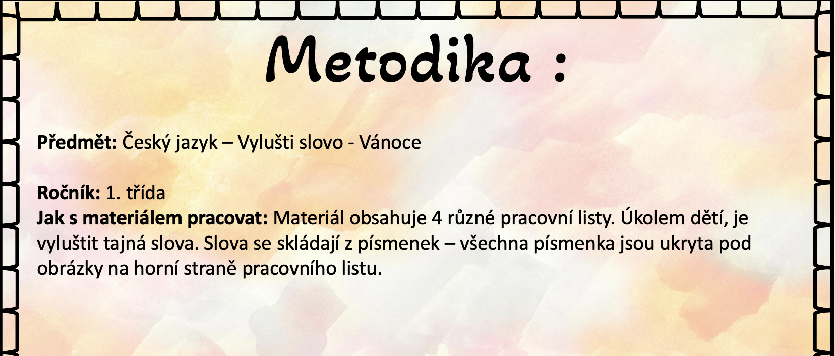 Materiál obsahuje 4 různé pracovní listy. Úkolem dětí, je vyluštit tajná slova. Slova se skládají z písmenek – všechna písmenka jsou ukryta pod obrázky nahorní straně pracovního listu.