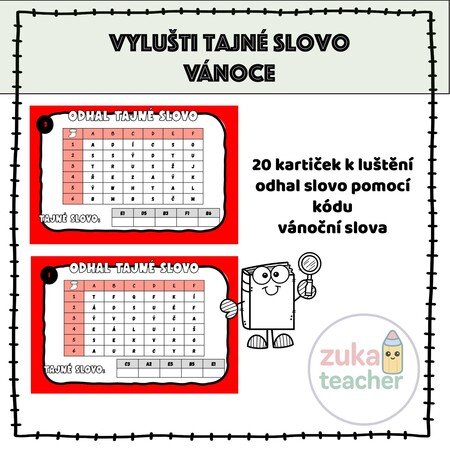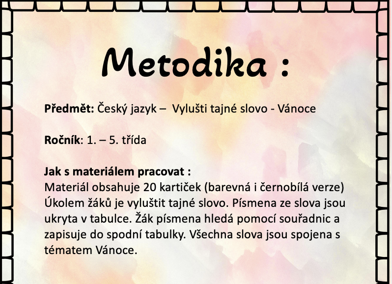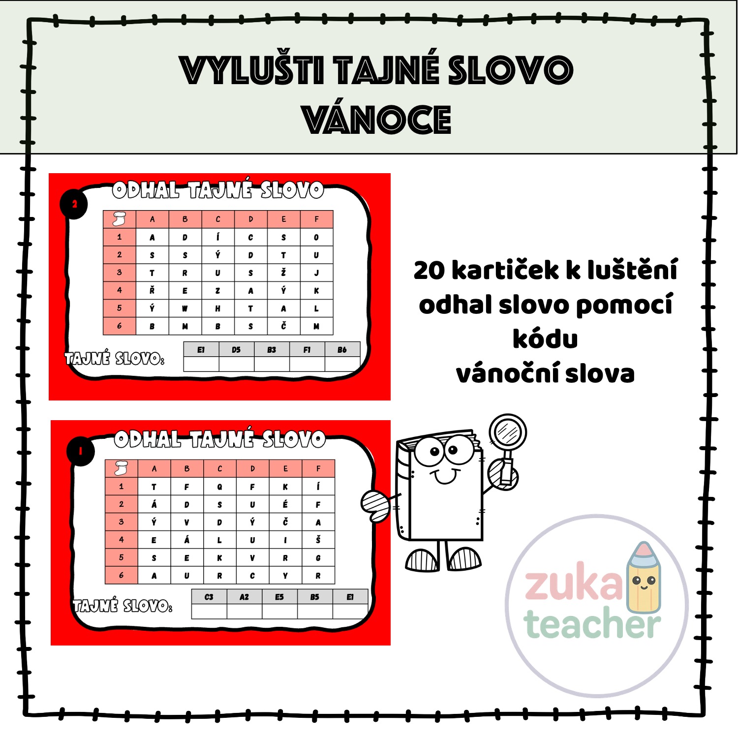 Úkolem žáků je vyluštit tajné slovo. Písmena ze slova jsou ukryta v tabulce. Žák písmena hledá pomocí souřadnic a zapisuje do spodní tabulky. Všechna slova jsou spojena s tématem Vánoce.